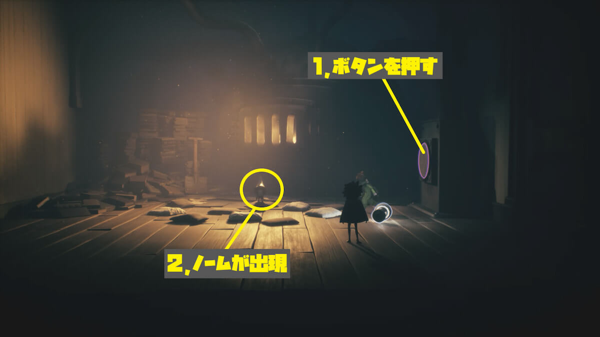 部屋のボタンを押すと、ヒューズを持ったノーム1/6が出現するので、「つかむ」ボタンを押して抱きしめましょう。
