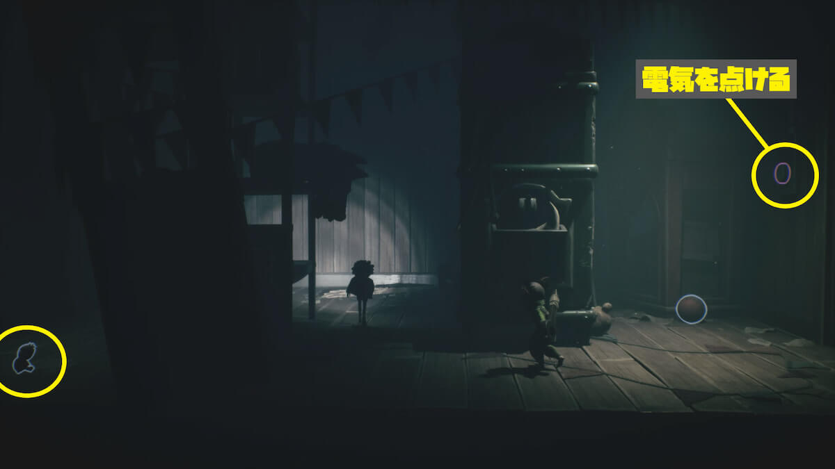 続いて左側の壁にあるボタンを押して通電させましょう。これはトロフィー「極刑」を獲得するために必要です。