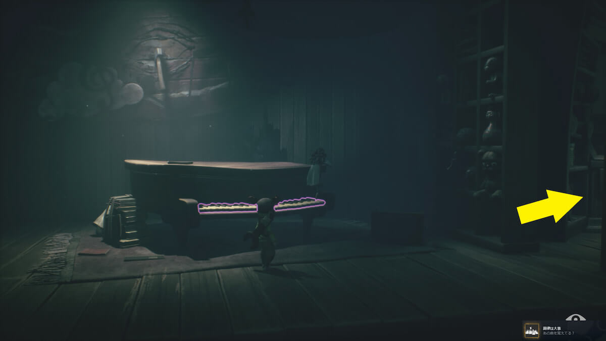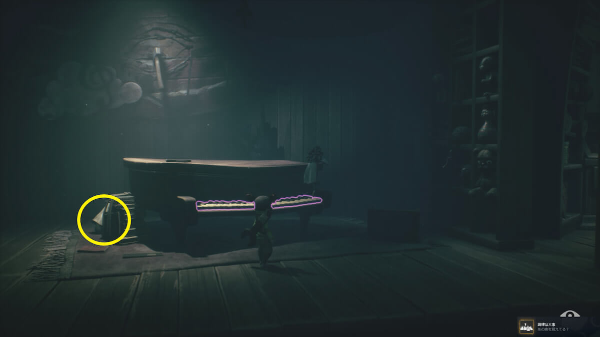 ピアノに乗って鍵盤の上を動き回るとトロフィー「調律は大事」を獲得でき、ノーム5/6が見つかります。