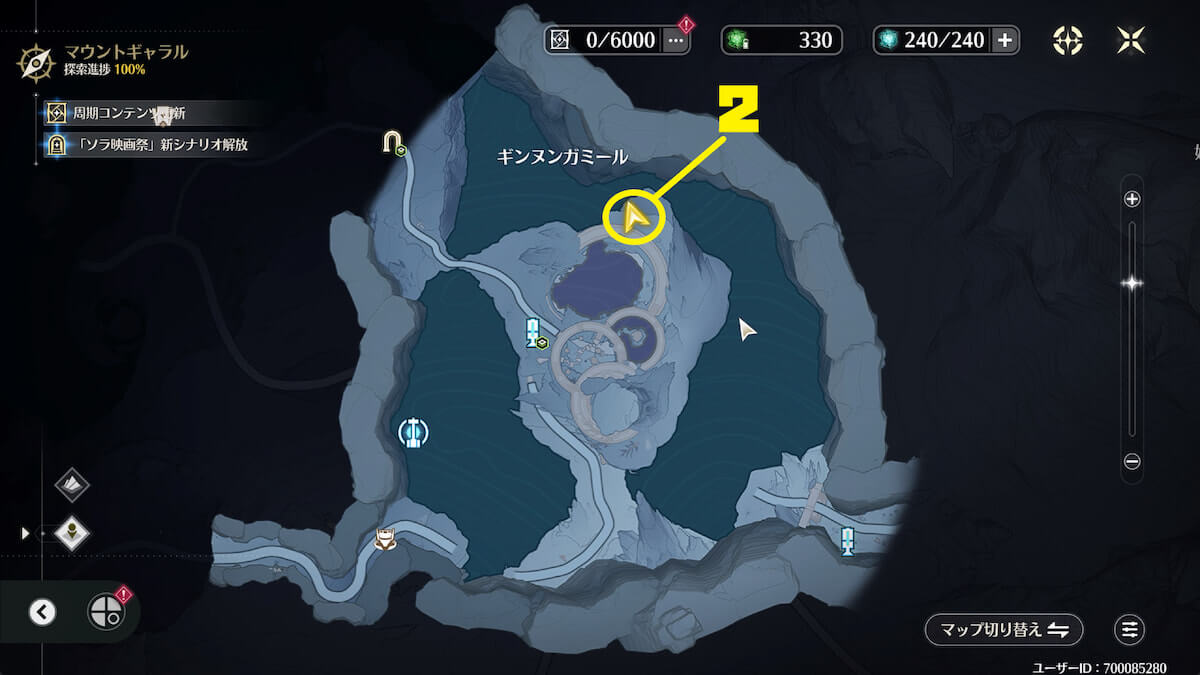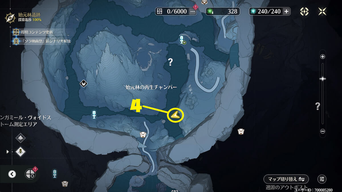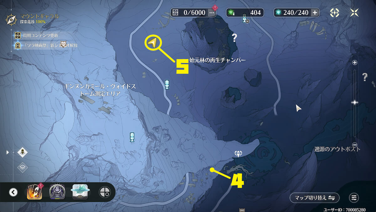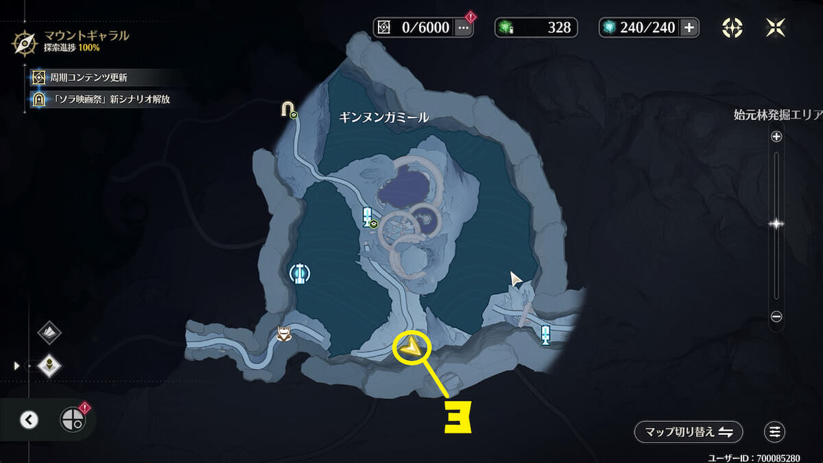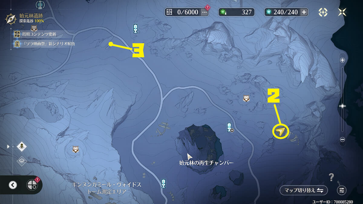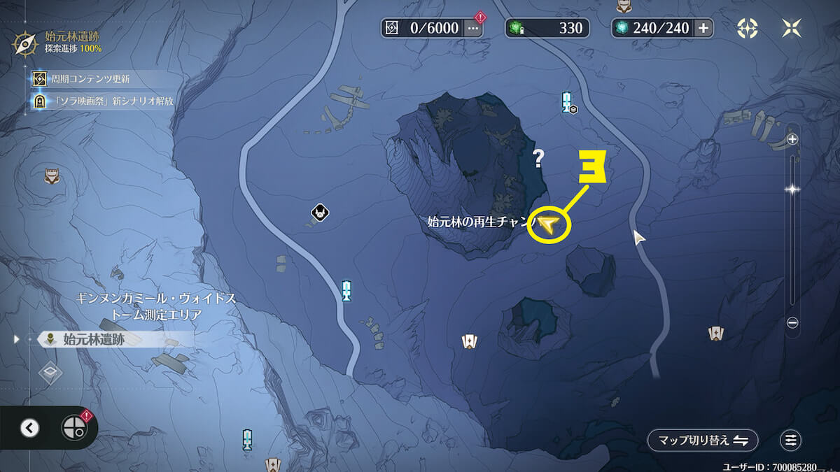 「始元林遺跡」の地下にある氷に近づいて敵を倒し、音骸顕現・グローモスで氷を破壊すると、実績を獲得できます。
