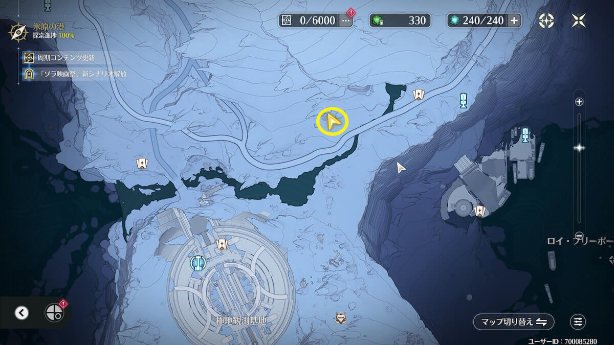 「氷原の港」の極地観測基地にある端末を調べて映像を確認すると、実績を獲得できます。