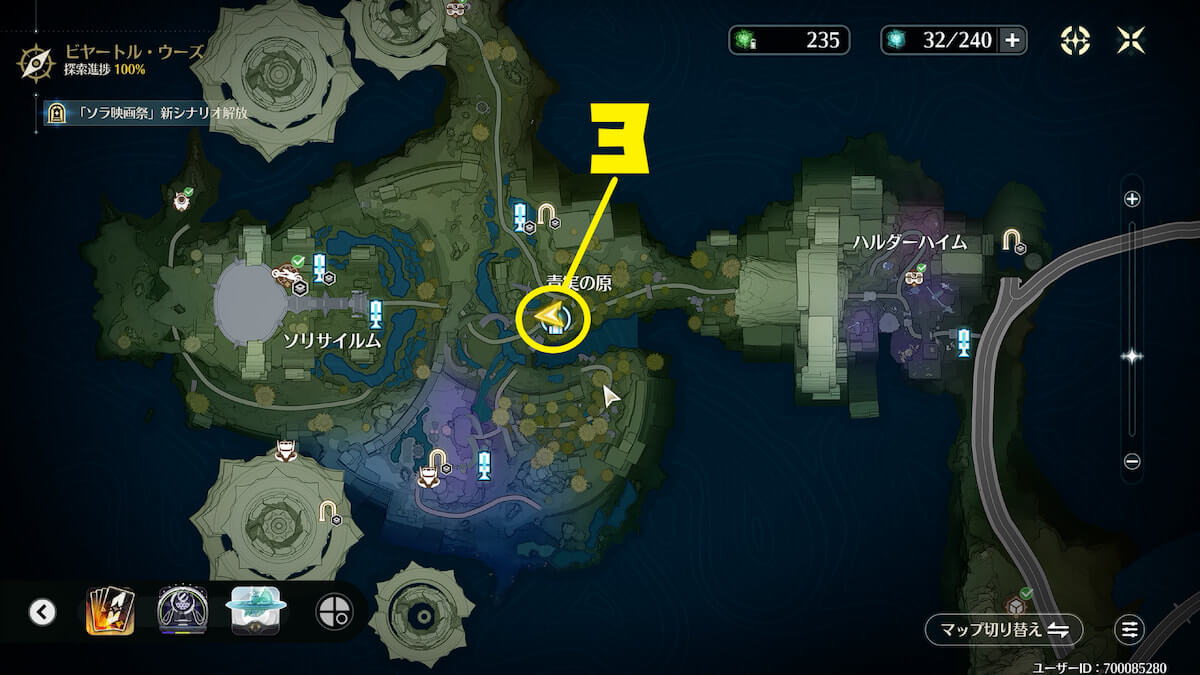 マップ画像3番の位置。「ビヤートル・ウーズ」の中枢信号塔の近くに痕跡の追跡があります。