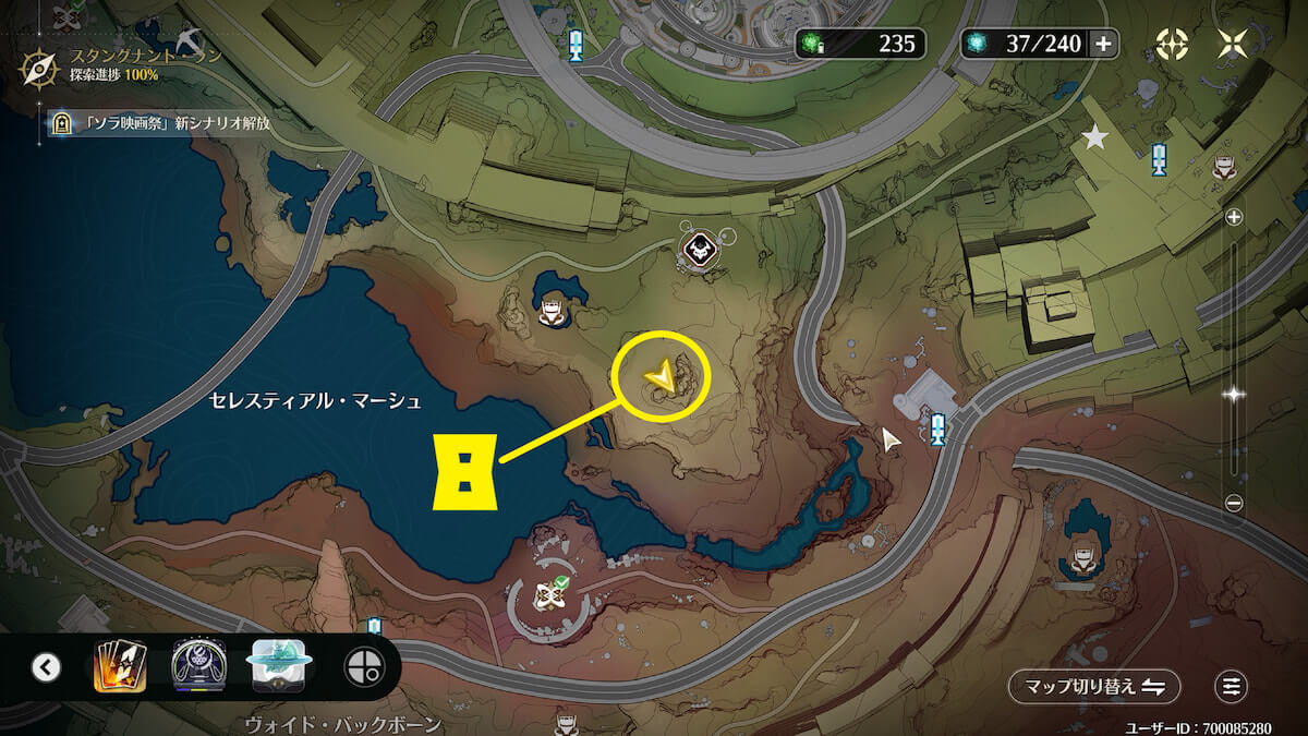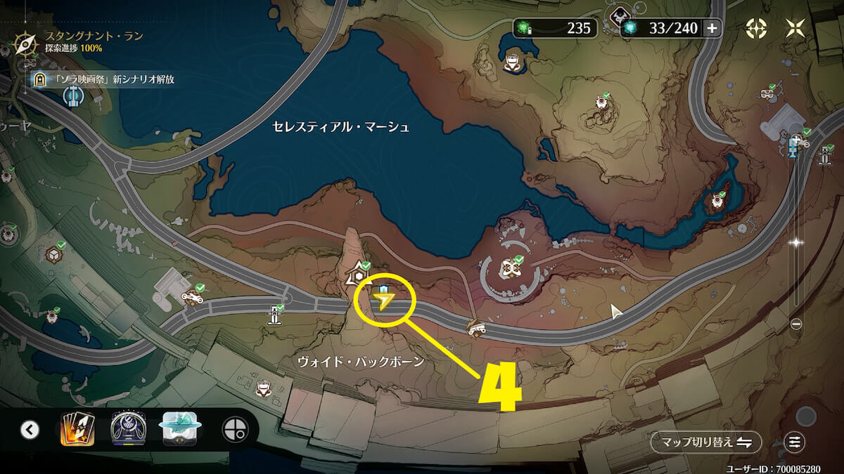 マップ画像4番の位置。「スタングナント・ラン」の中枢信号塔の上空に痕跡の追跡があります。