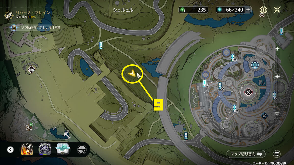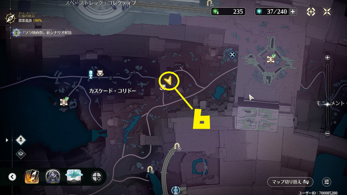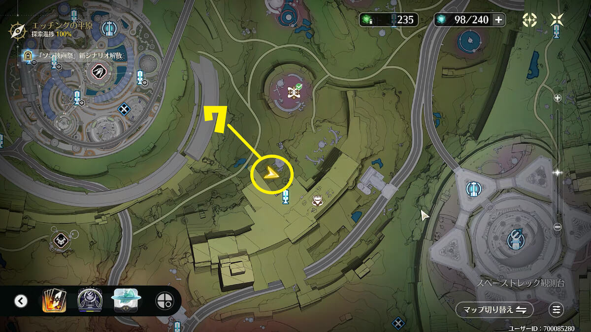 マップ画像1番の位置。「リンクドスパイン」の中枢信号塔の近くに痕跡の追跡があります。
