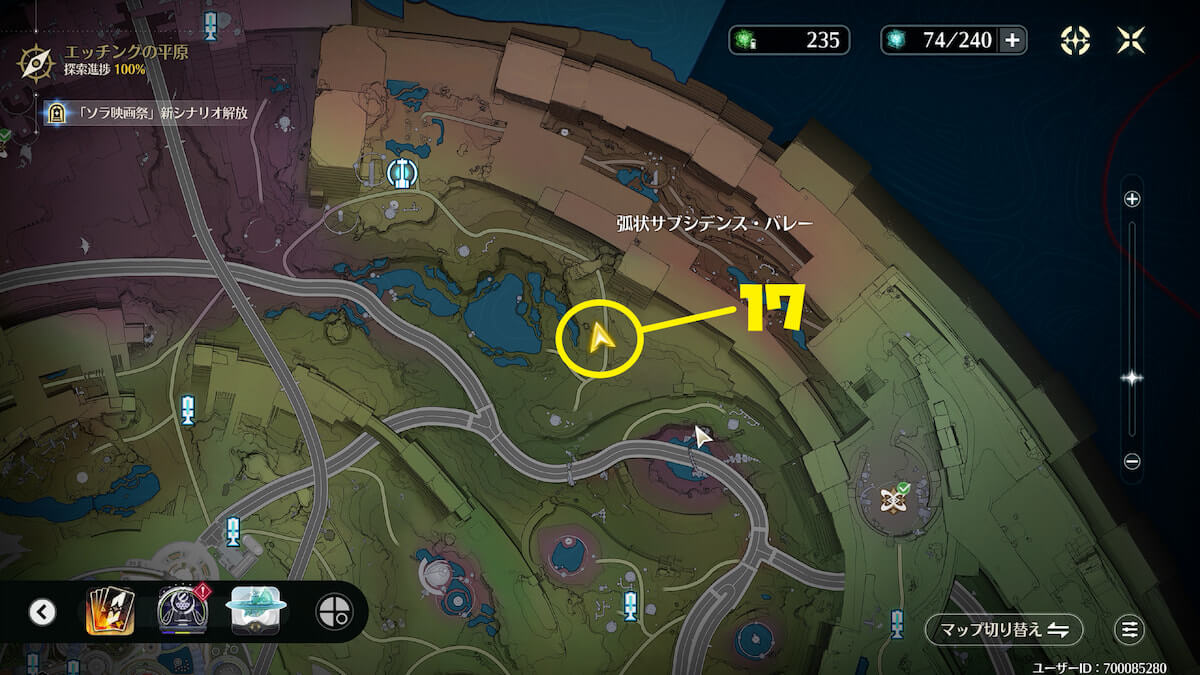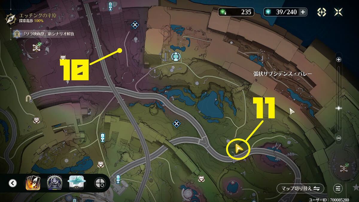 マップ画像10番の位置。「エッチングの平原」北の道路脇に痕跡の追跡があります。