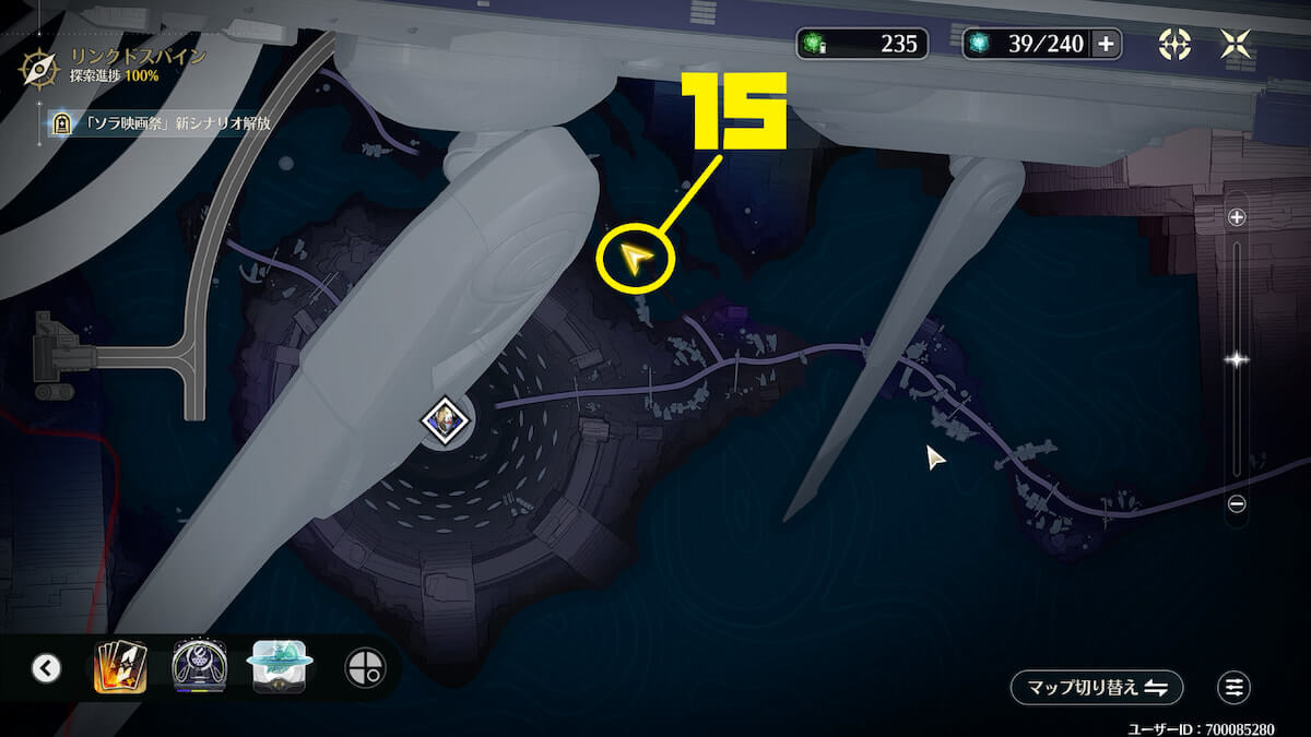 マップ画像15番の位置。「リンクドスパイン」西の分かれ道に痕跡の追跡があります。