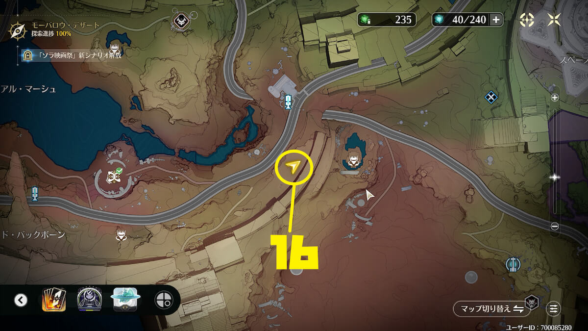 マップ画像16番の位置。「モーバロウ・デザート」北の道路脇に痕跡の追跡があります。