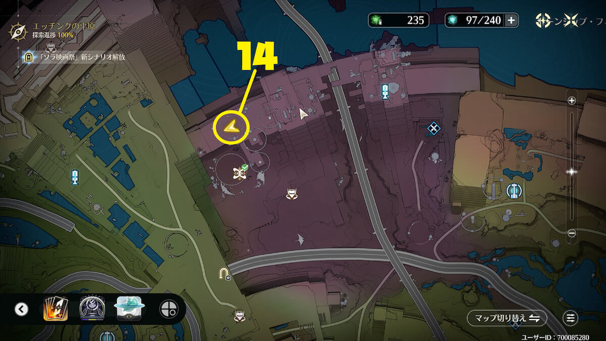 マップ画像14番の位置。「エッチングの平原」北西の崖上に痕跡の追跡があります。