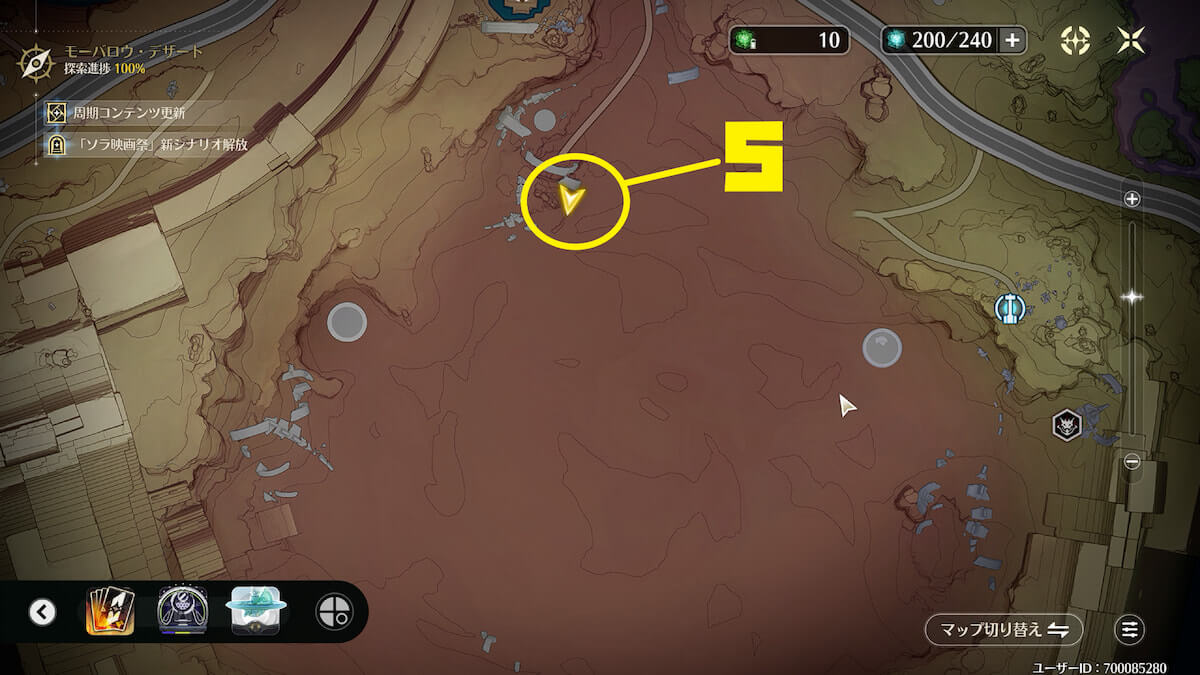 マップ画像5番の位置。「モーバロウ・デザート」の砂漠に痕跡の追跡があります。