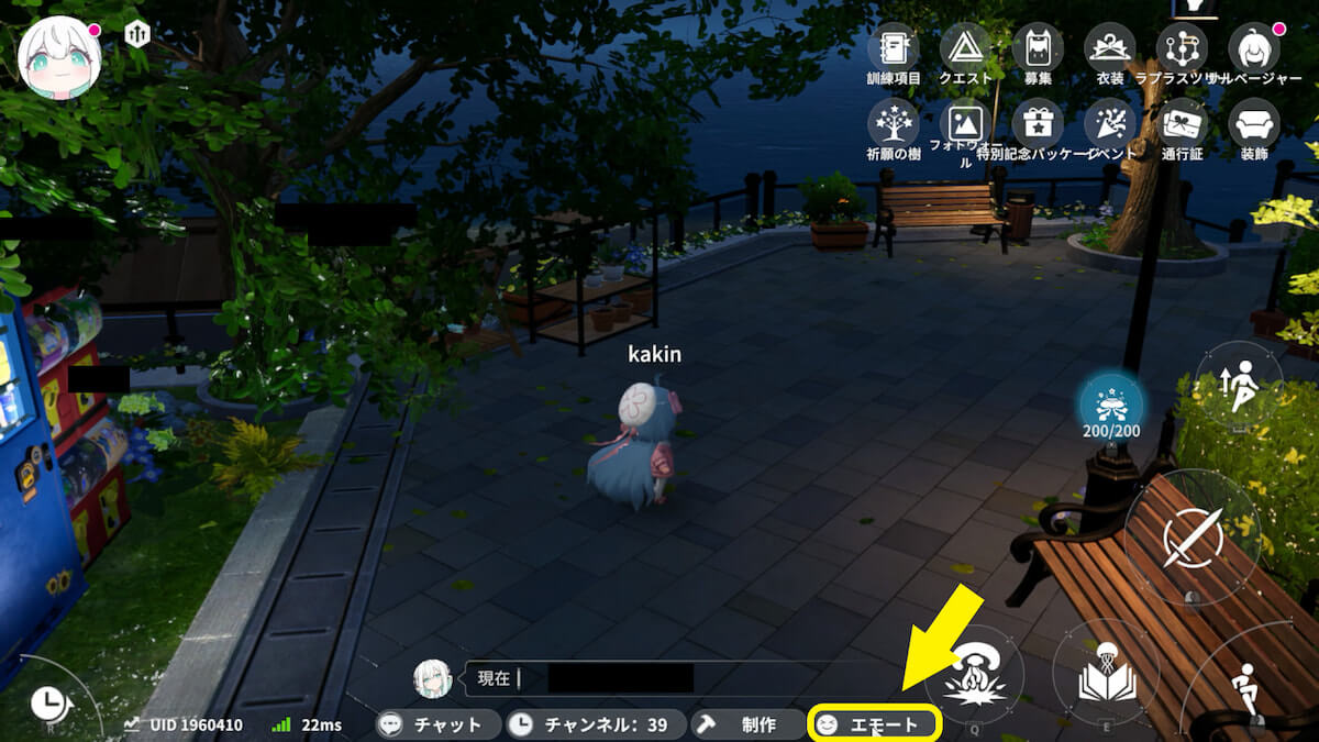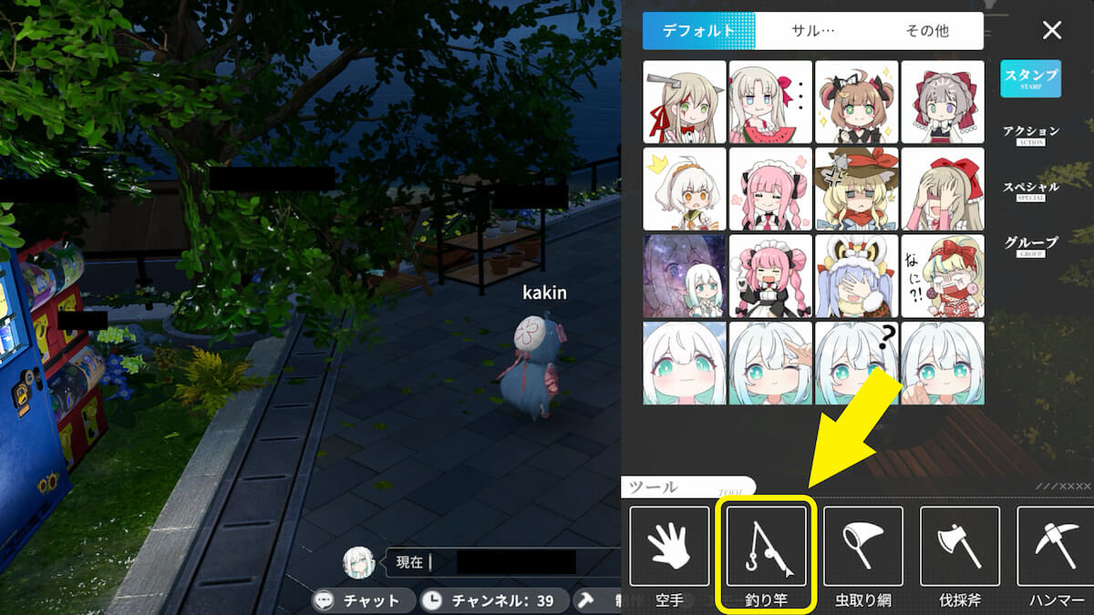 画面下の「エモート」を押し、「釣り竿」を選択すると装備できます。