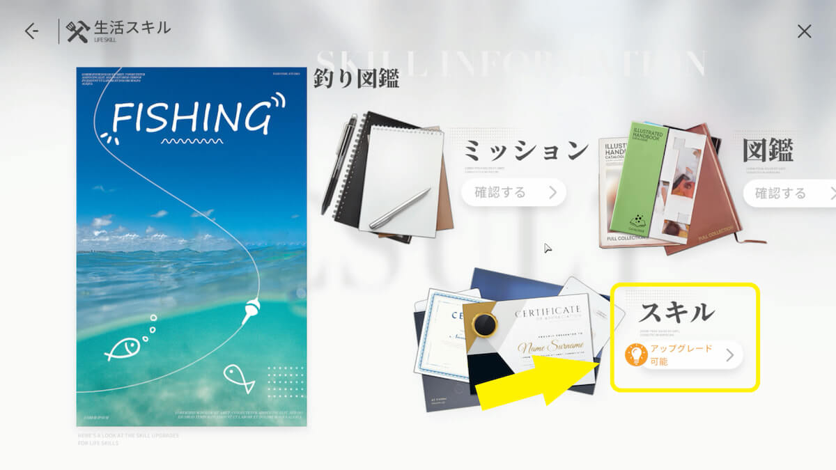 スマホメニューの「生活」から釣りのページを開き、「スキル」を選択すると、釣りに関するスキルを習得できます。