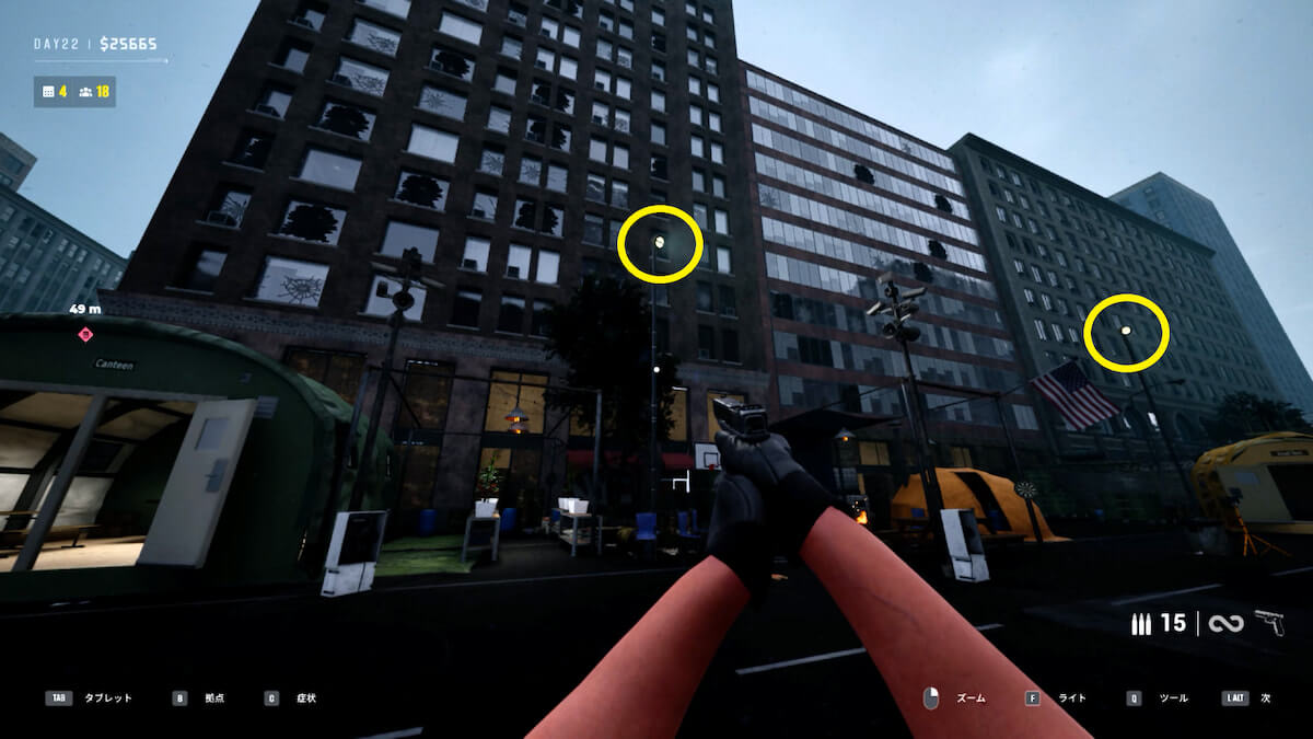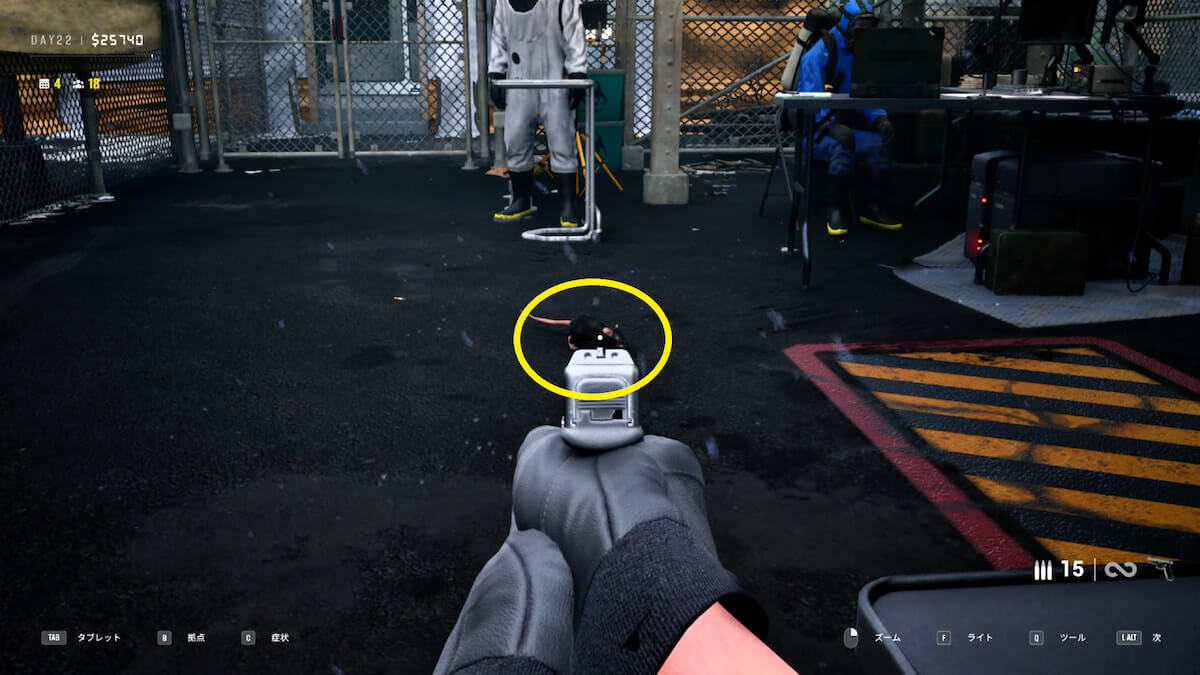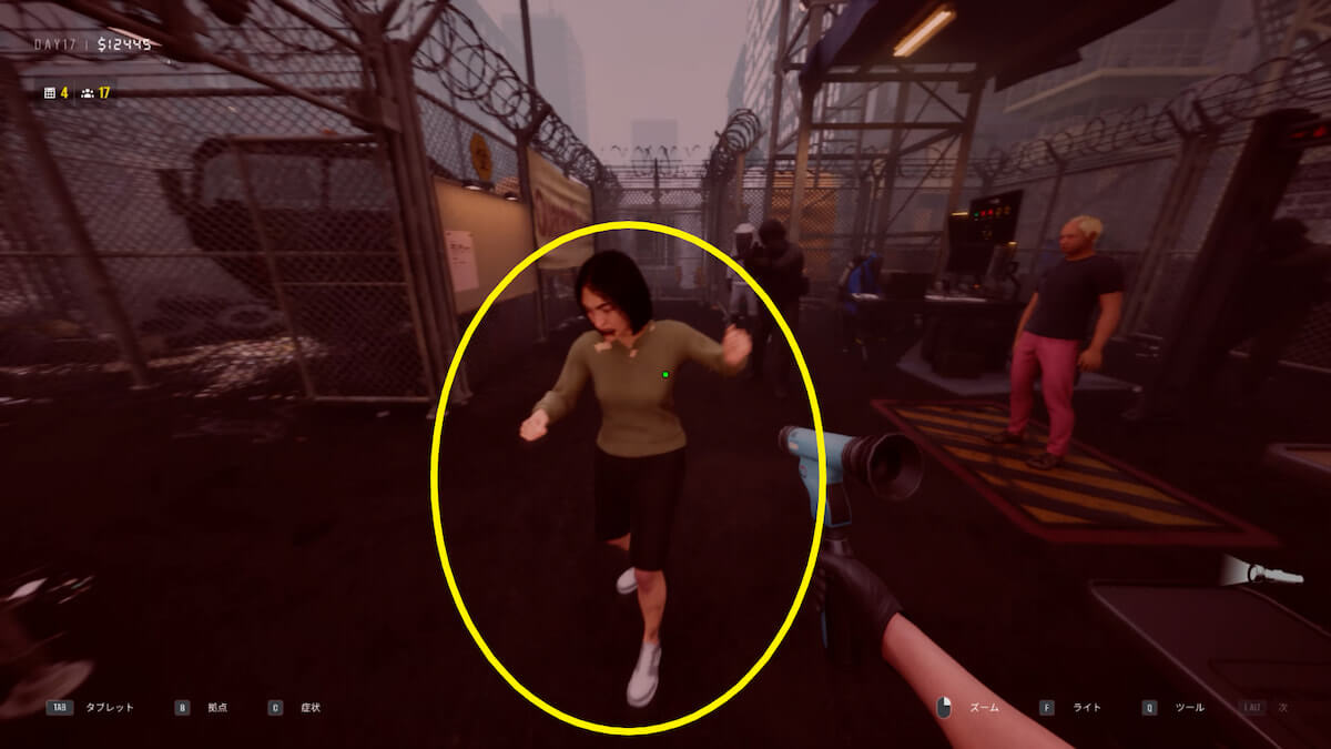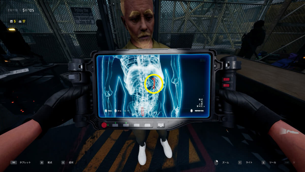 X線検査で禁制品を発見したら、「E」キーでマークを付け、左側にいる白服のNPCに摘出してもらいます。