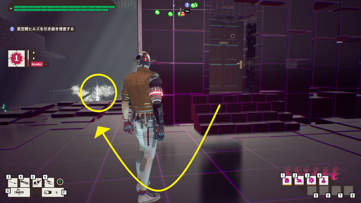 亜空間ヒルズ・エリア3の南側へ進むと、セーブポイントがある区画で、取材メモ「気をつけることだ」を発見できます。