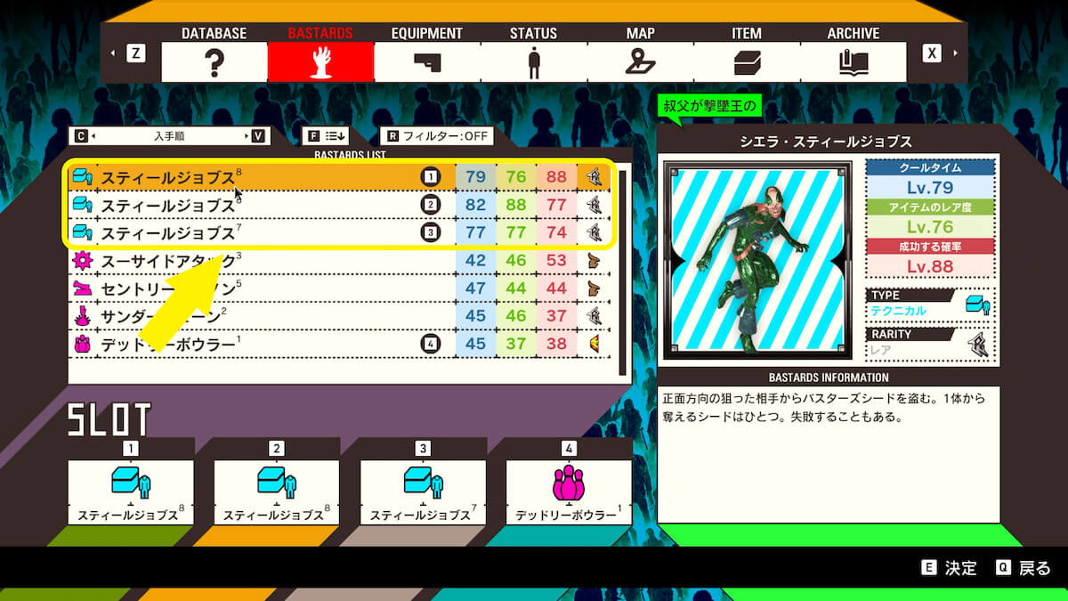 バスターズ「スティールジョブス」を3体入手します。成功率と品質に影響するため、レベルは上げられるだけ上げましょう。