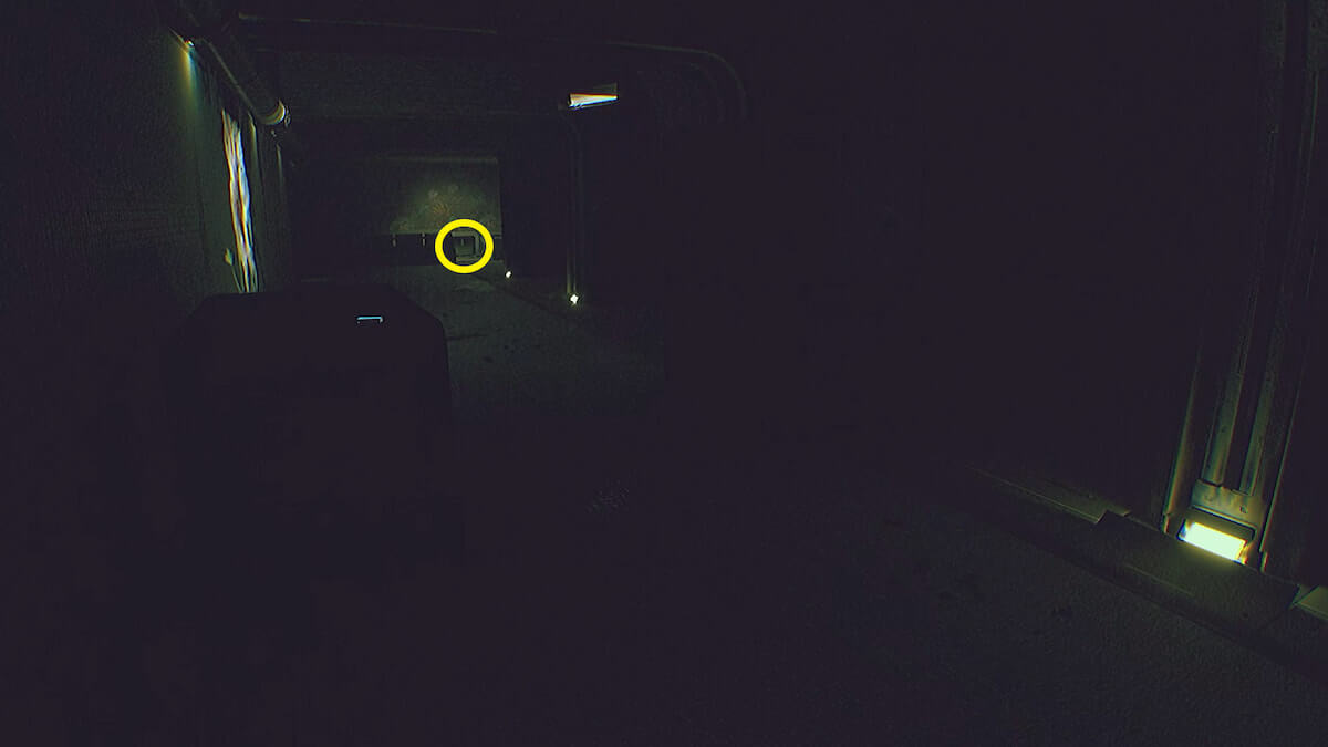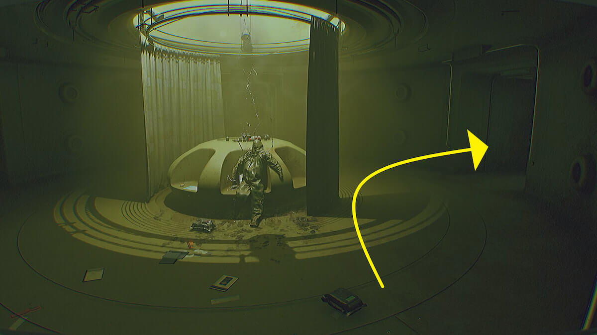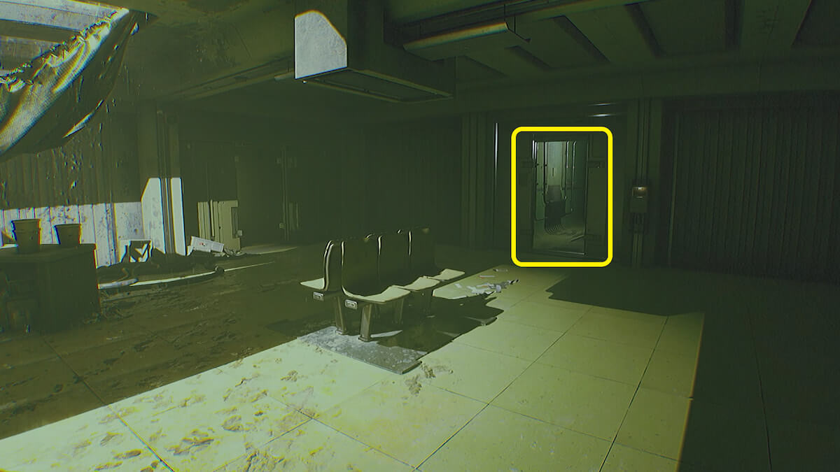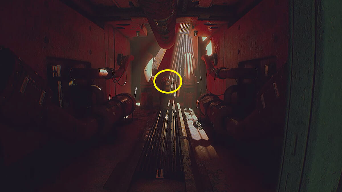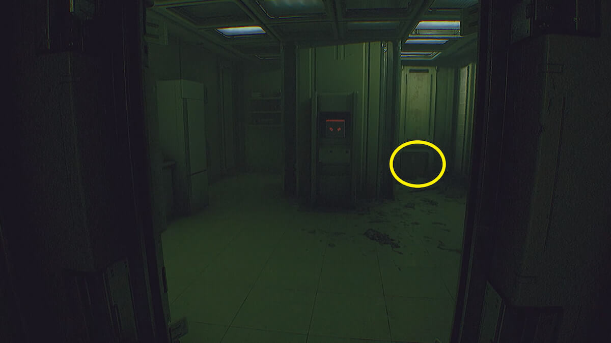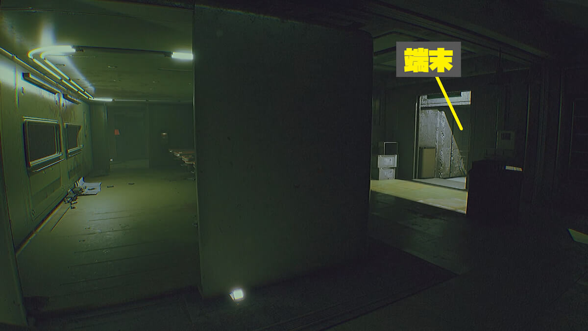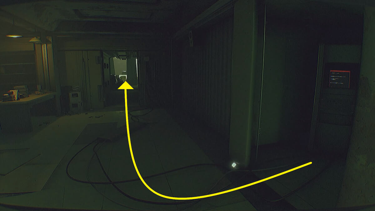 端末操作によって開いたドアから進み、左奥に見える通気口を通り抜けます。