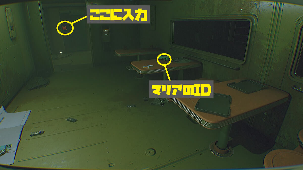 食堂に着いたら中央のテーブルからマリアのIDを確認します(敵が徘徊開始)。