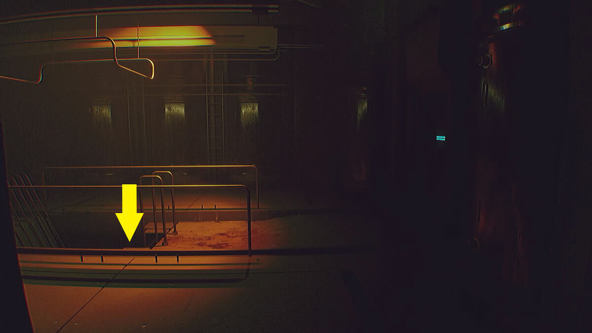 通気口から出て浸水した部屋に到着したら、右奥の通路へ進み、画像〇の隙間を潜り抜けましょう。