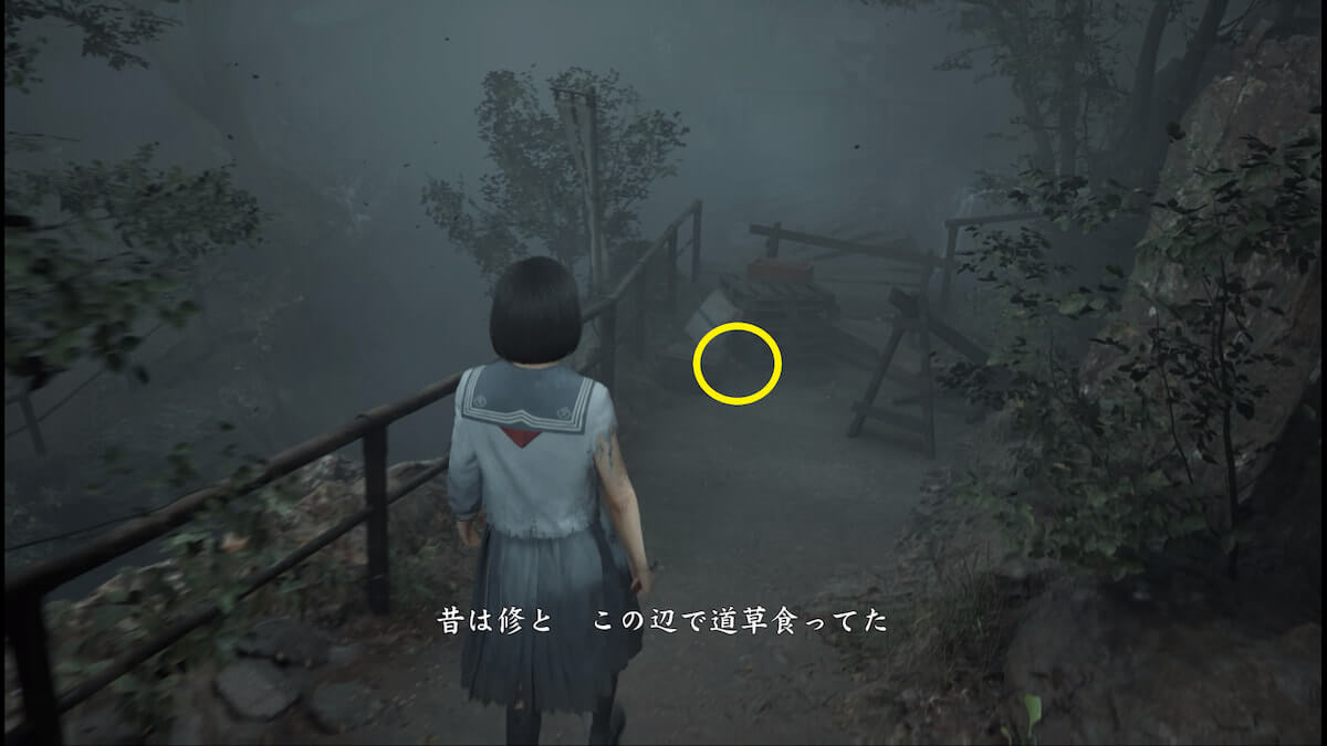 走って逃げるイベントが終わったら、祠の横にある階段を上ってアイテム「研究手記の写真その4」を入手できます。