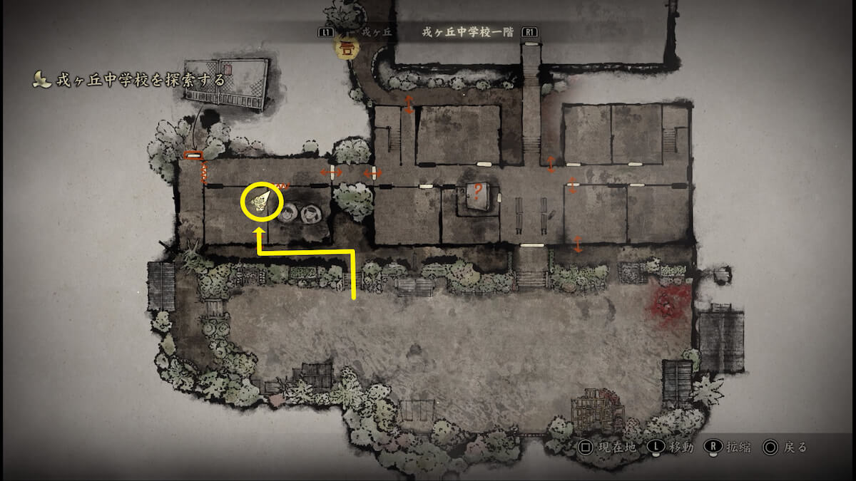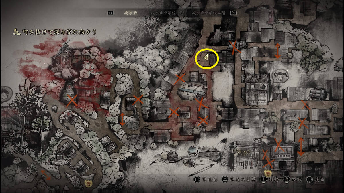 戎ヶ丘中学校の前まで進み、Uターンして南の路地に入ると、行き止まりでアイテム「割れた和装下駄」を入手できます。