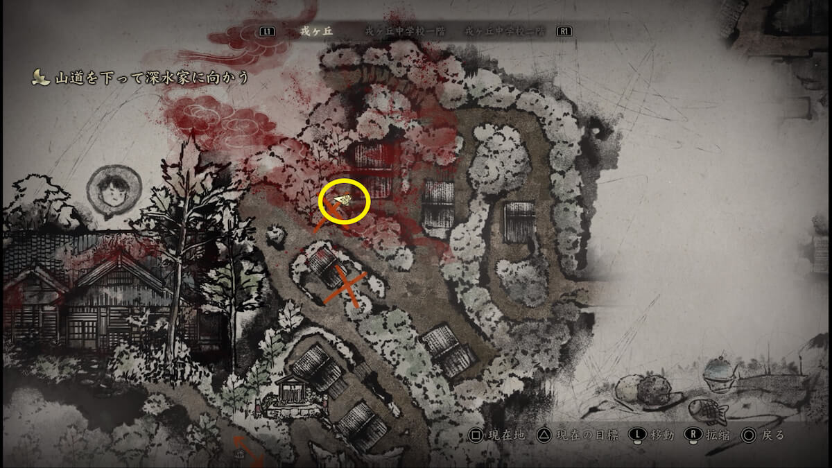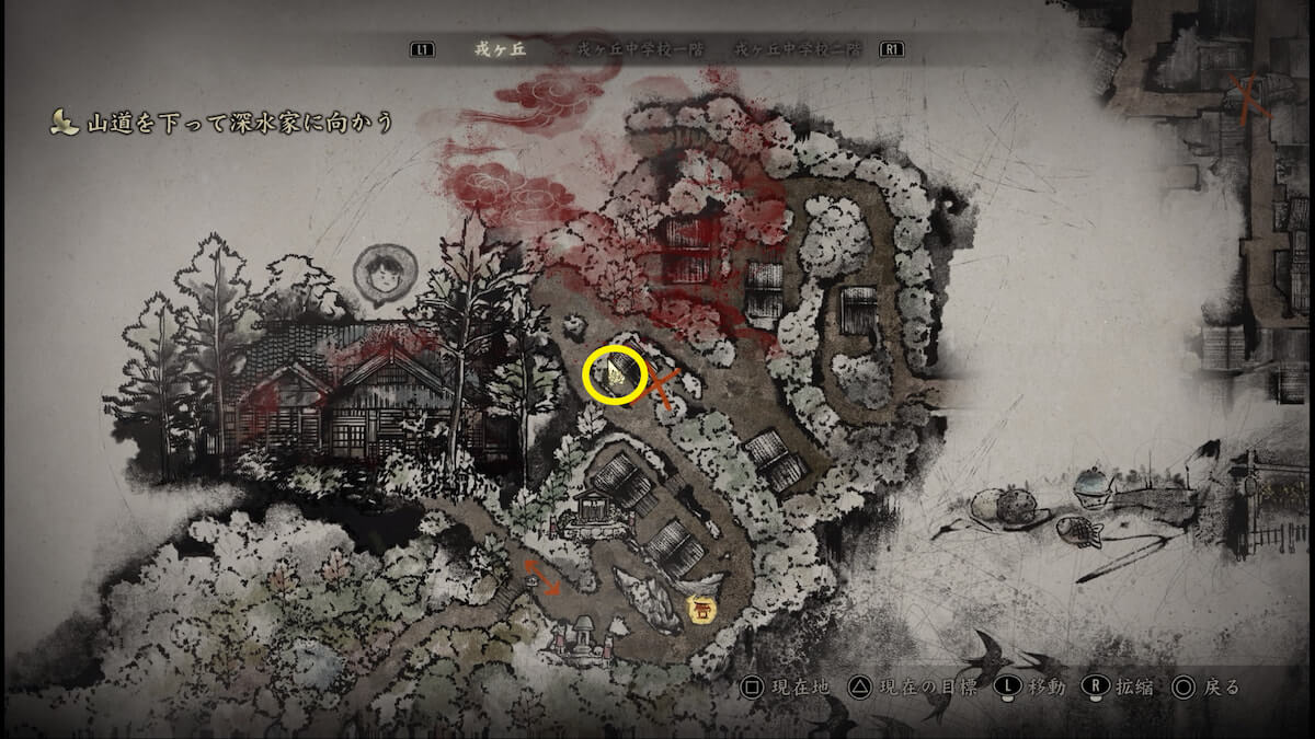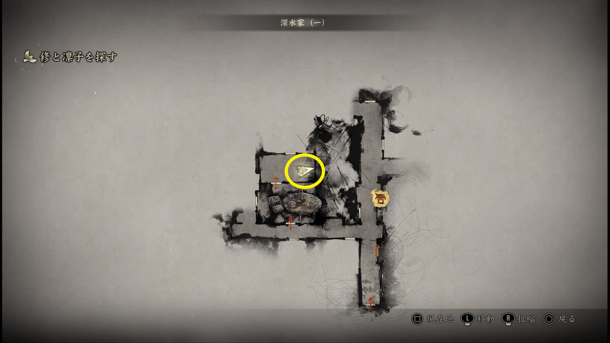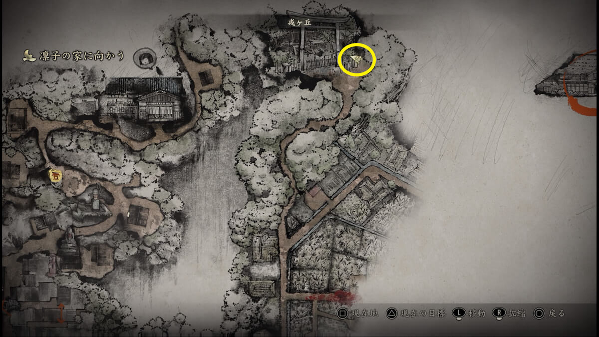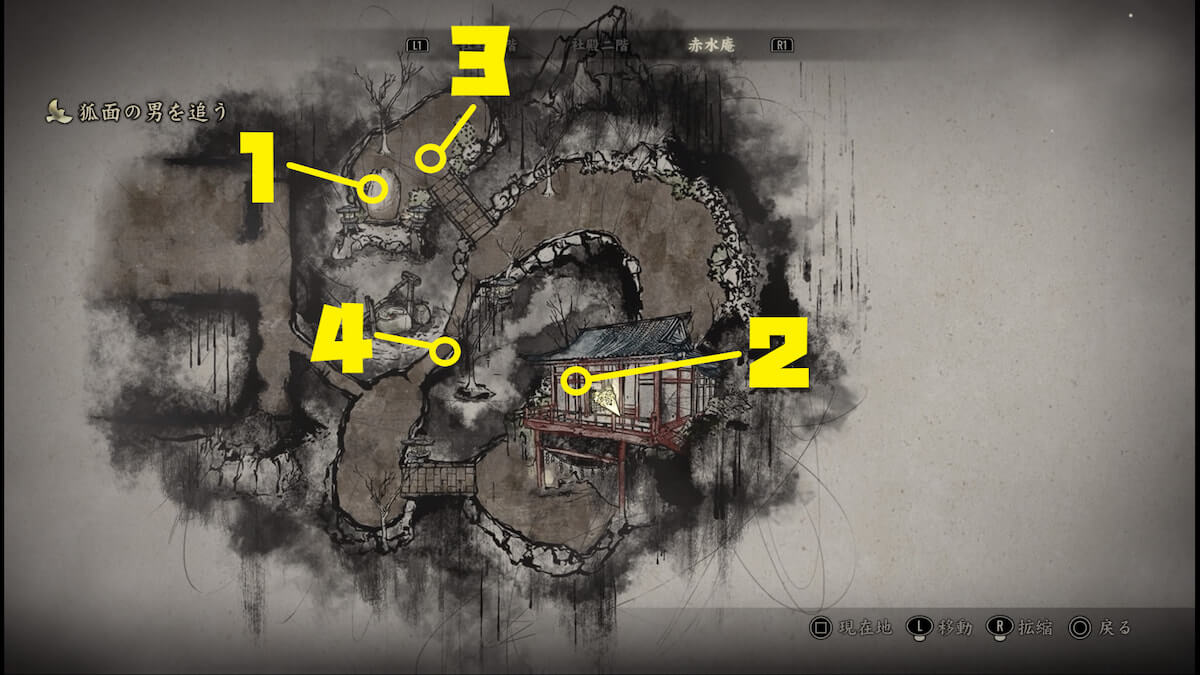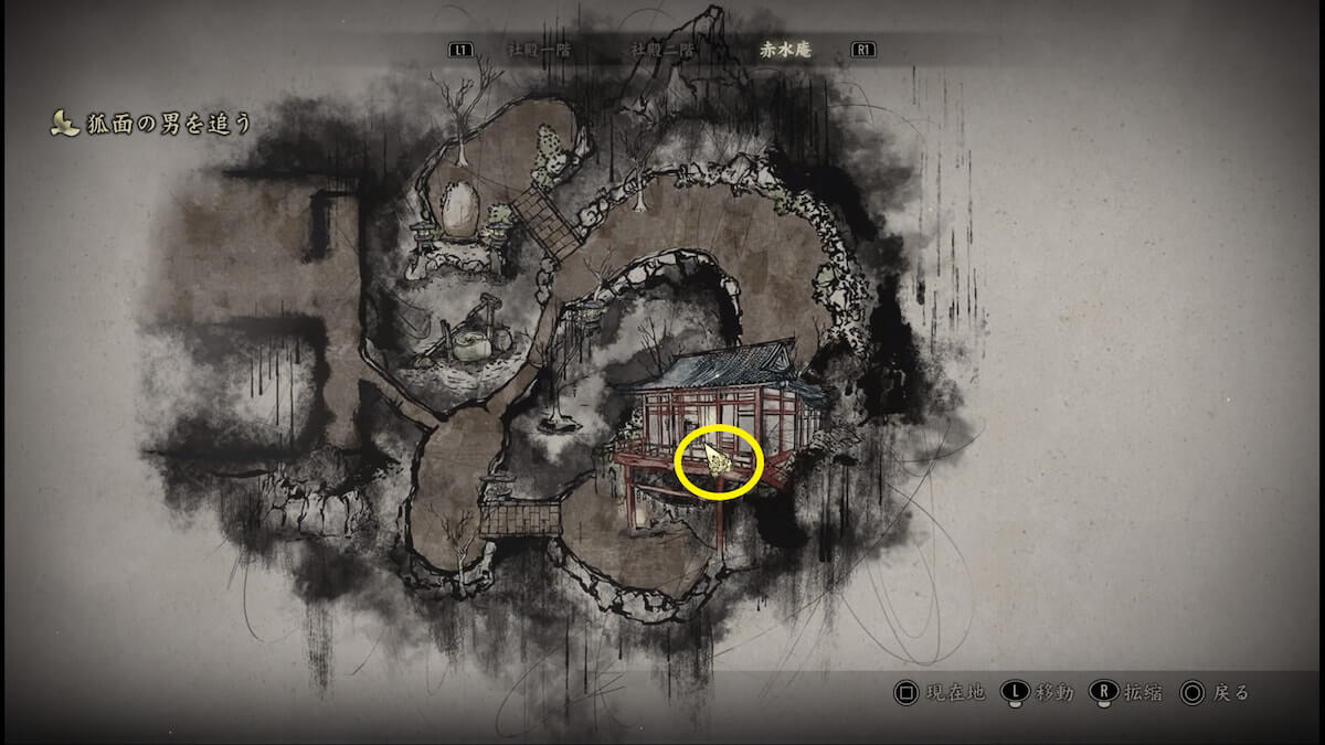 開始地点から画像矢印を参考に進み、「赤水庵」に移動します。