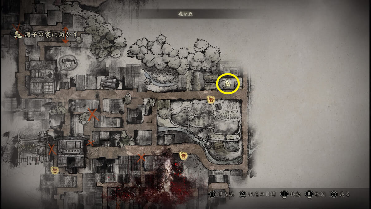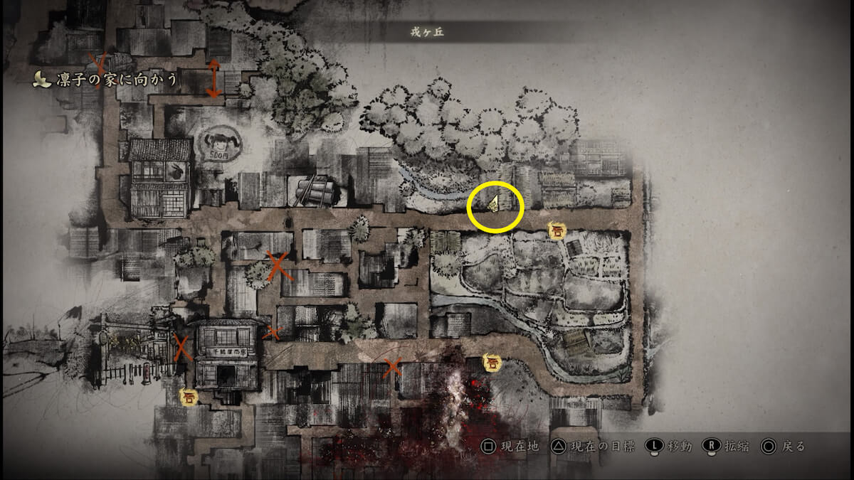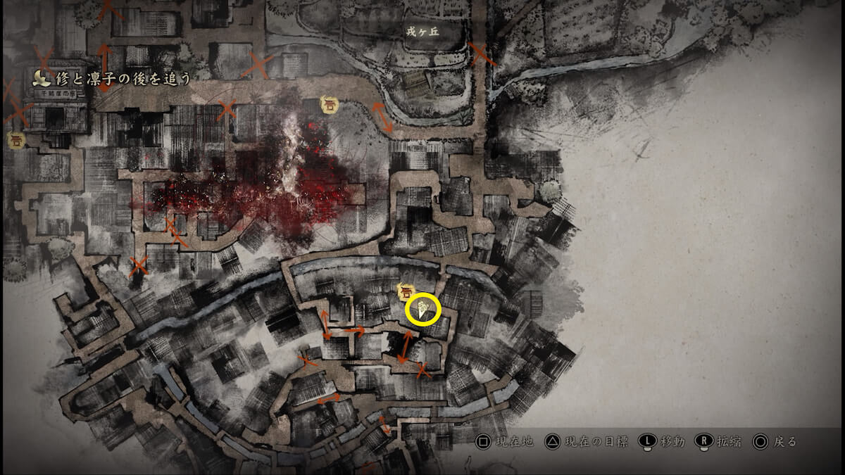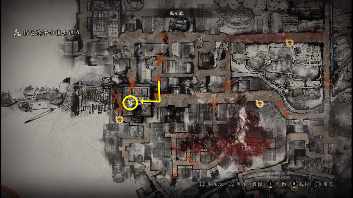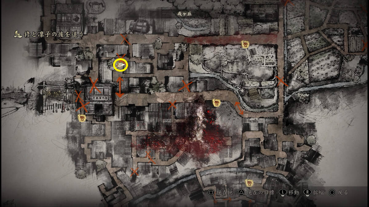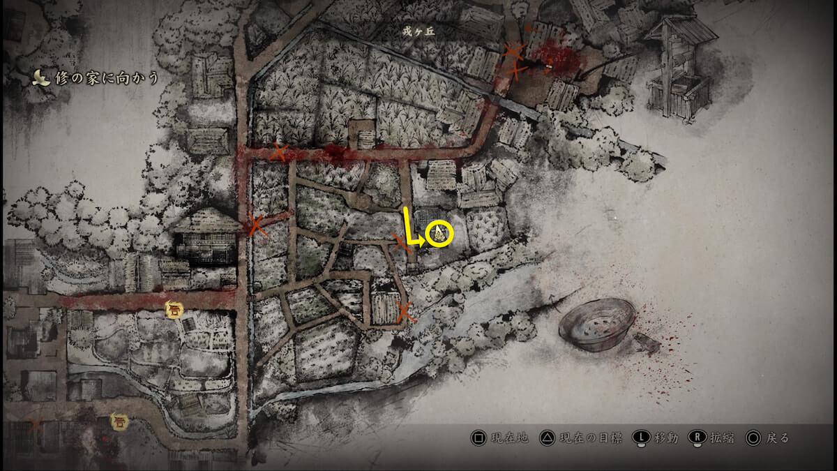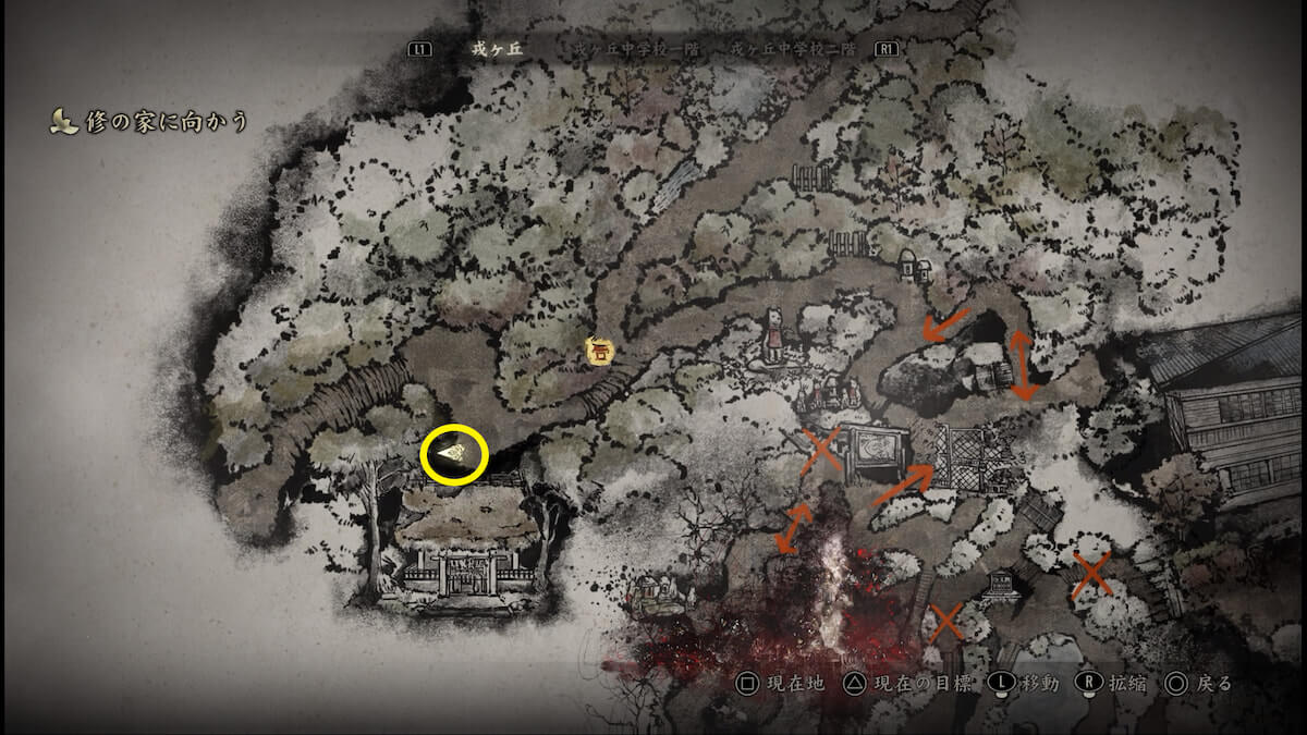 開始地点から画像矢印を参考に進み、「赤水庵」に移動します。