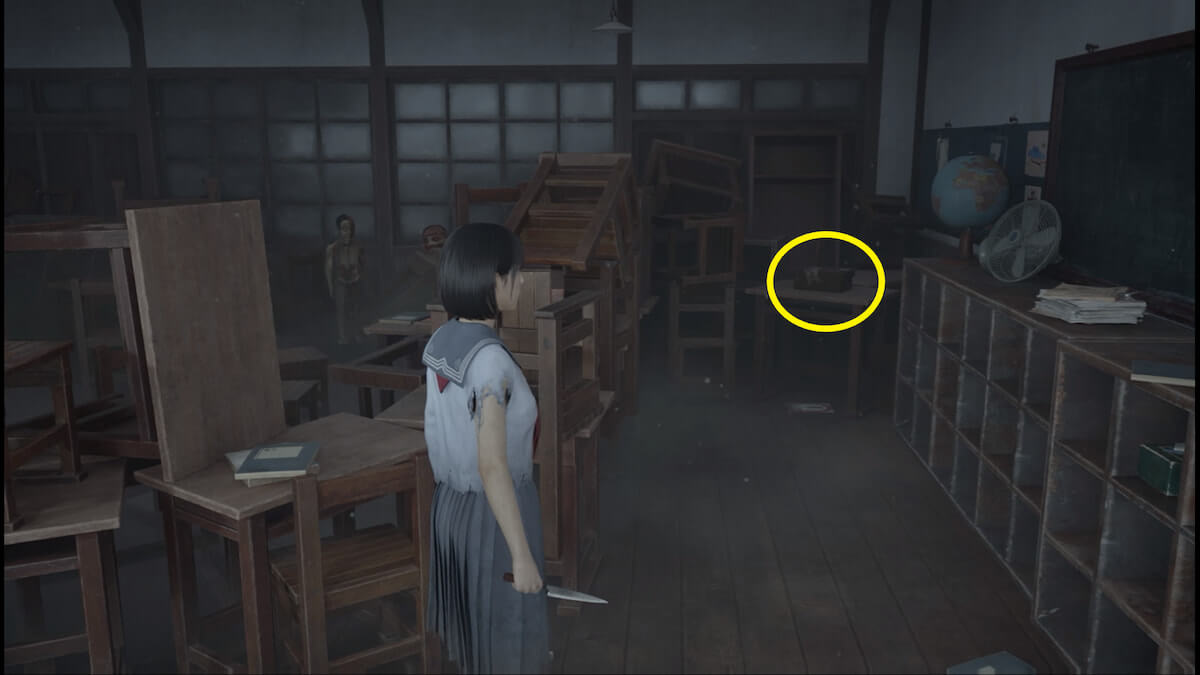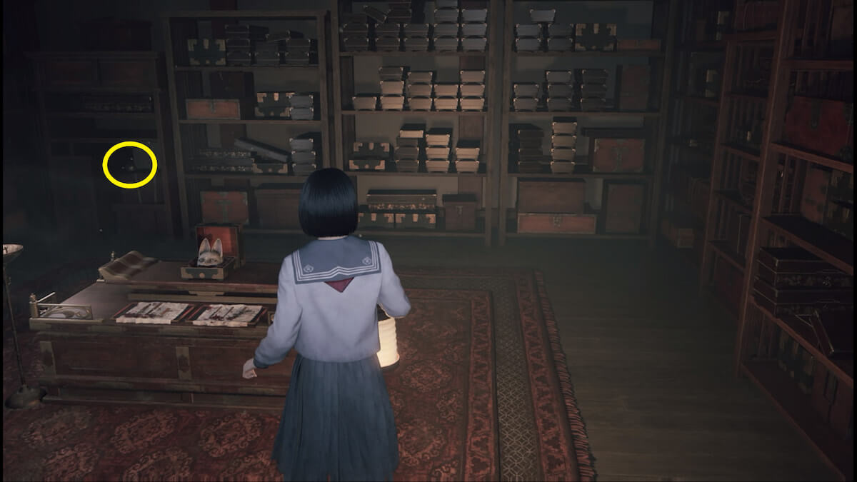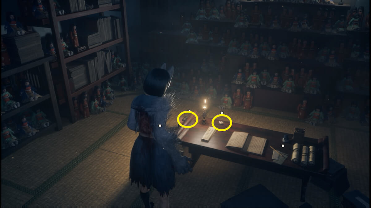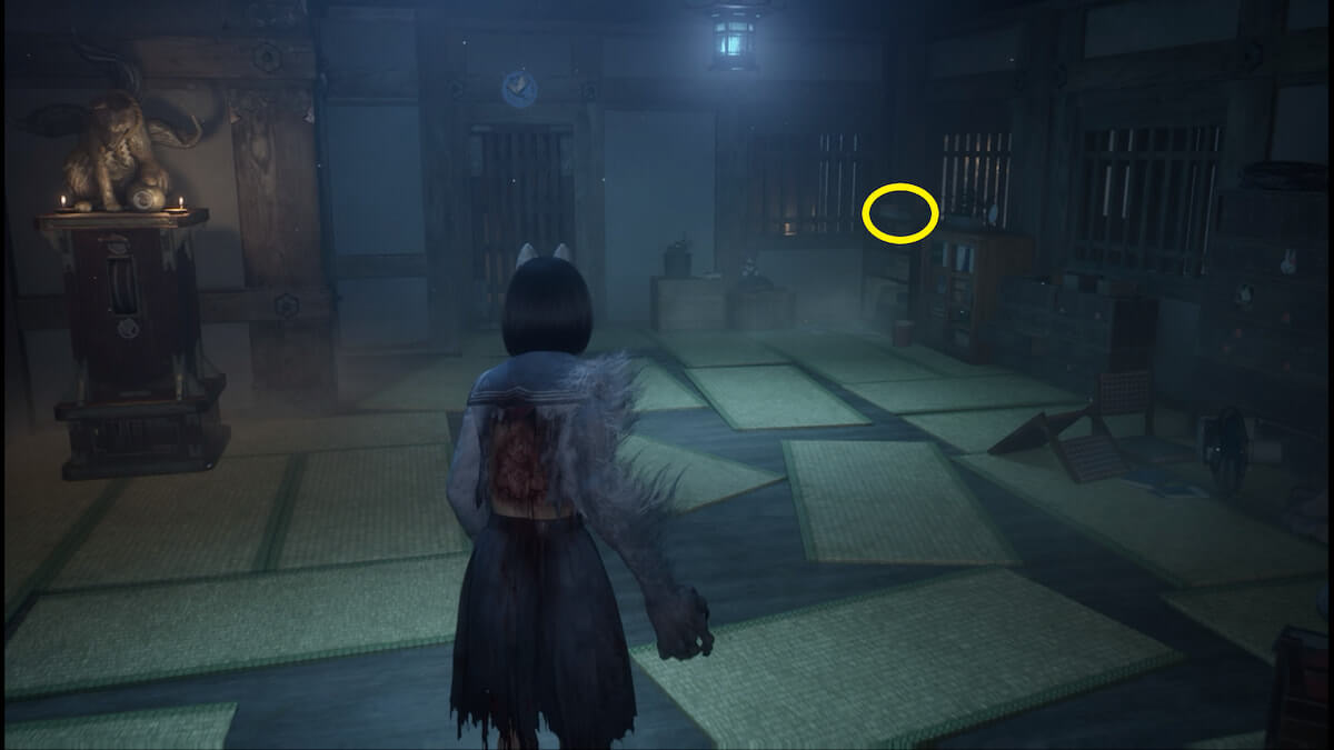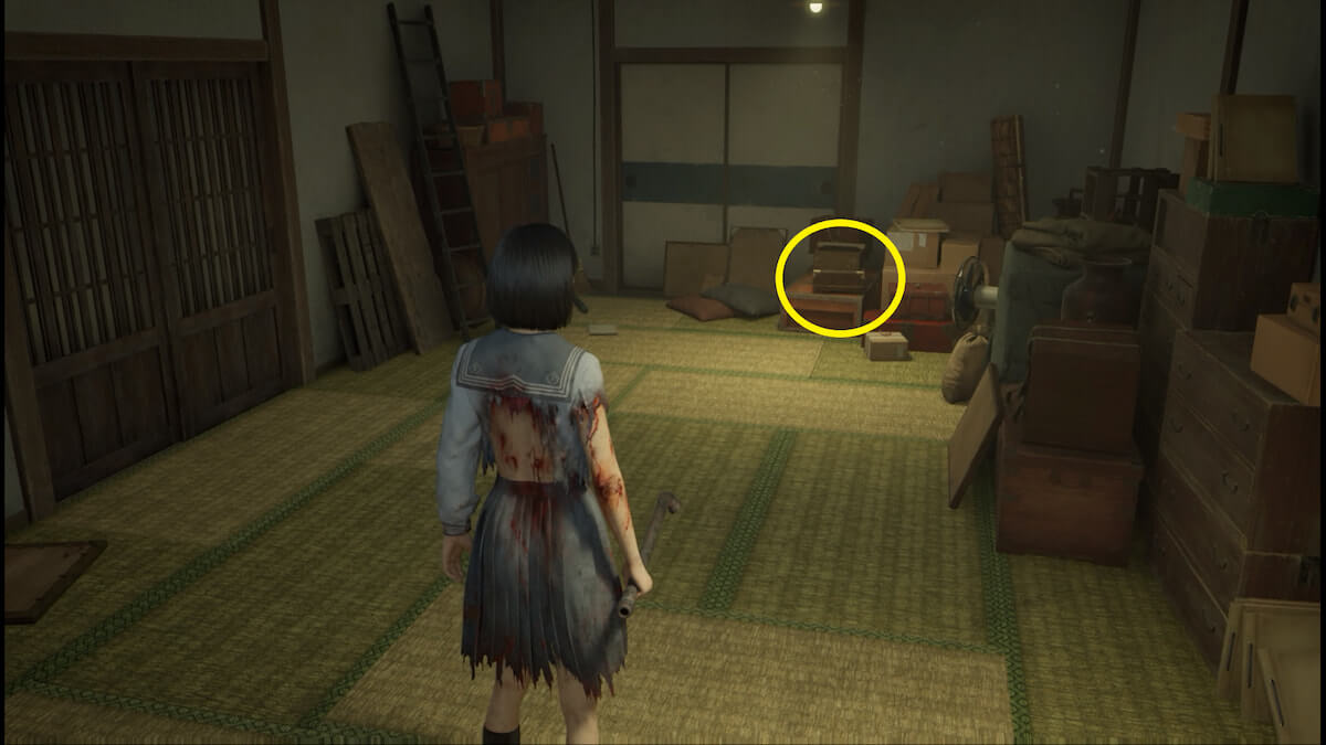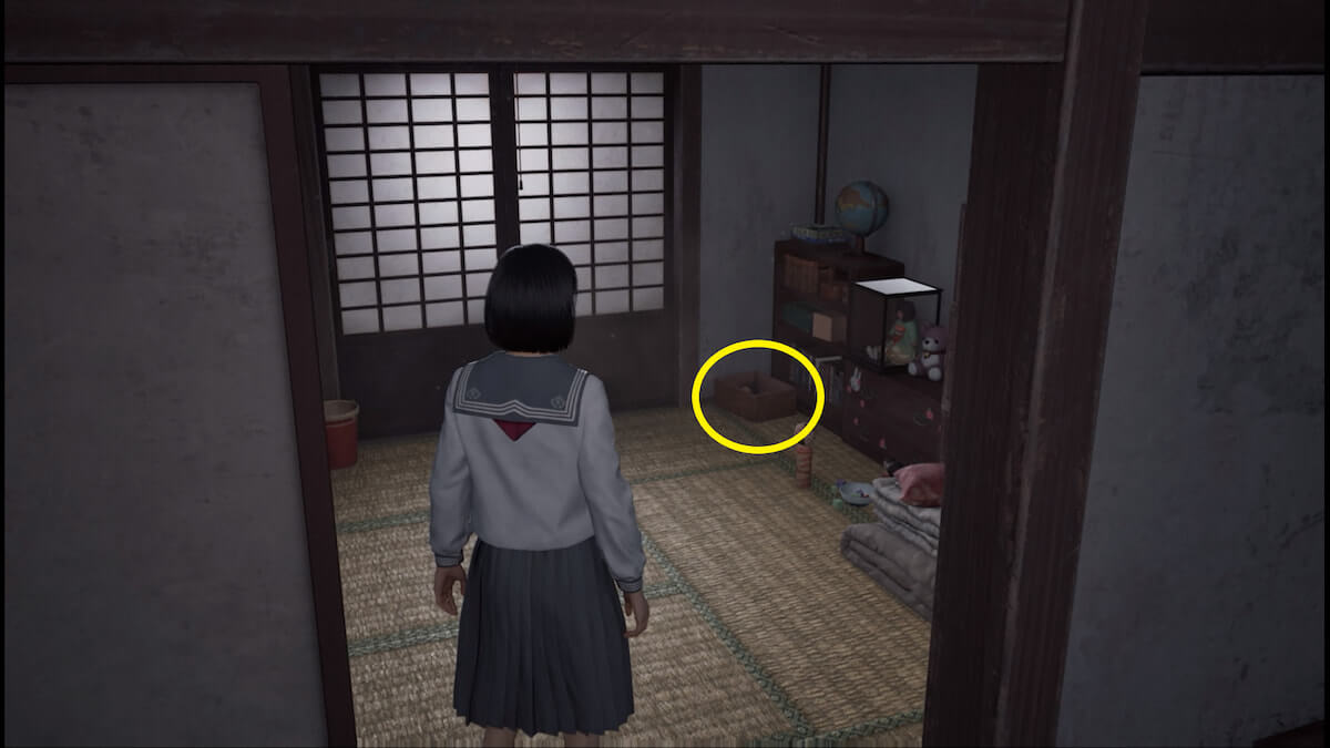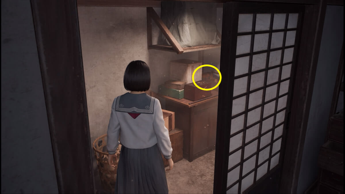 キッチンの襖を開けて物置に入ると、棚の箱からアイテム「色あせた花嫁人形」を入手できます。