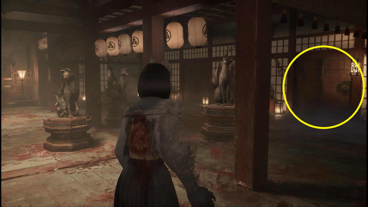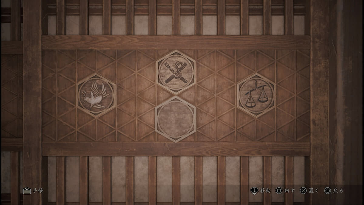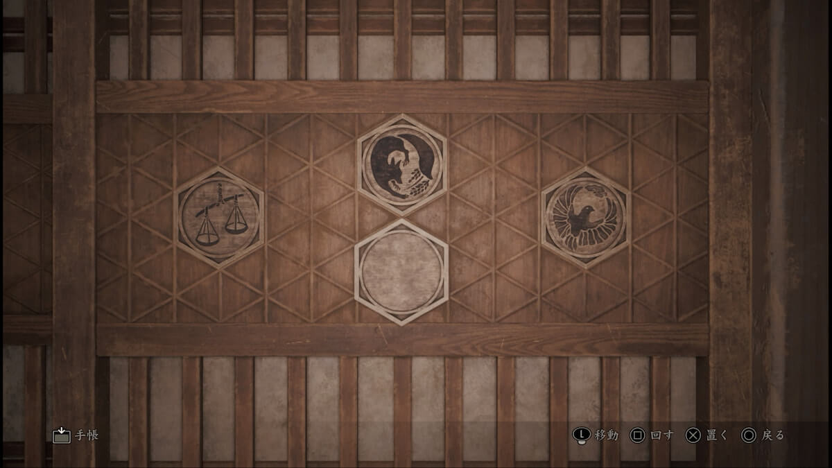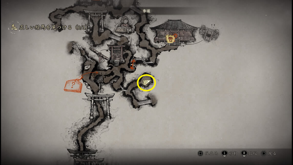 続いて、お稲荷様の紋章がある右側の扉(2枚目画像〇)を開けると、中で能力強化アイテム「祈願絵馬」を入手できます。