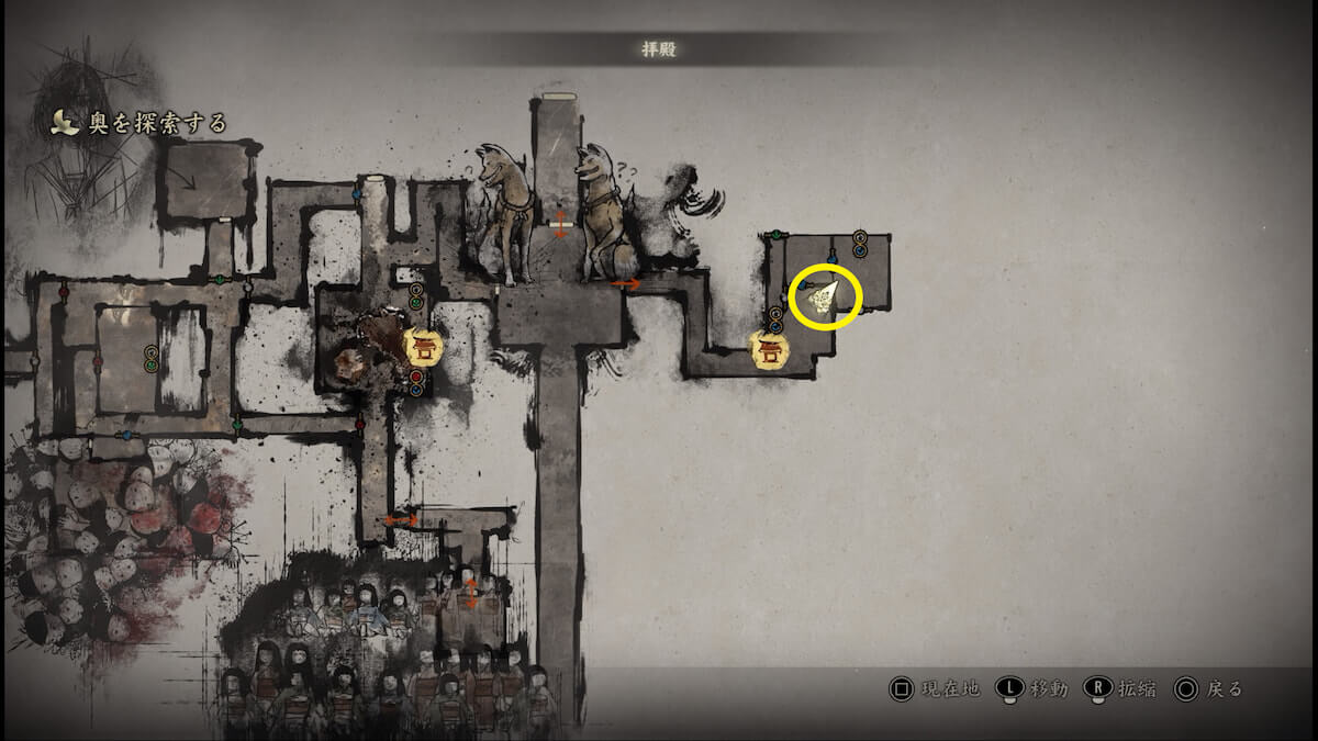 開始地点から北西の部屋に入り、お稲荷様の紋章がある箱を開けると、文書「復讐記(6)」と能力強化アイテム「祈願絵馬」を入手できます。