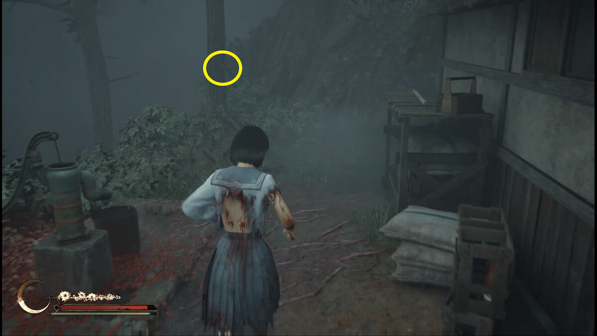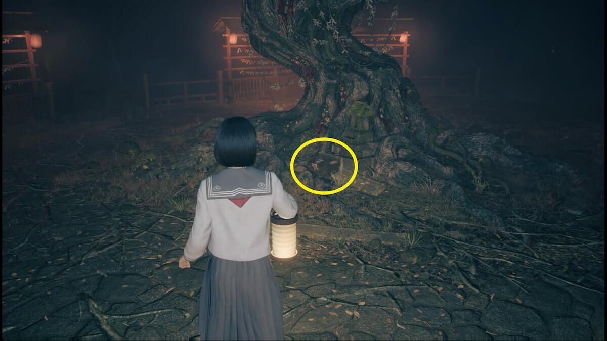 参道を下って建物の横に回ると、木に刺さっているアイテム「お父さんの古い包丁」を入手できます。