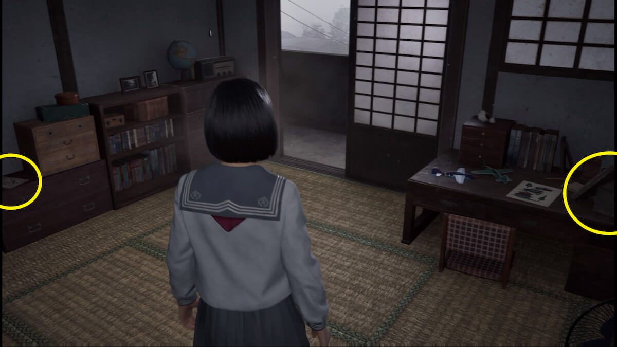 最初の祠を通り過ぎ、正面に見える建物に入ります。1階のちゃぶ台を調べると、アイテム「研究手記の写真その1」を入手できます。