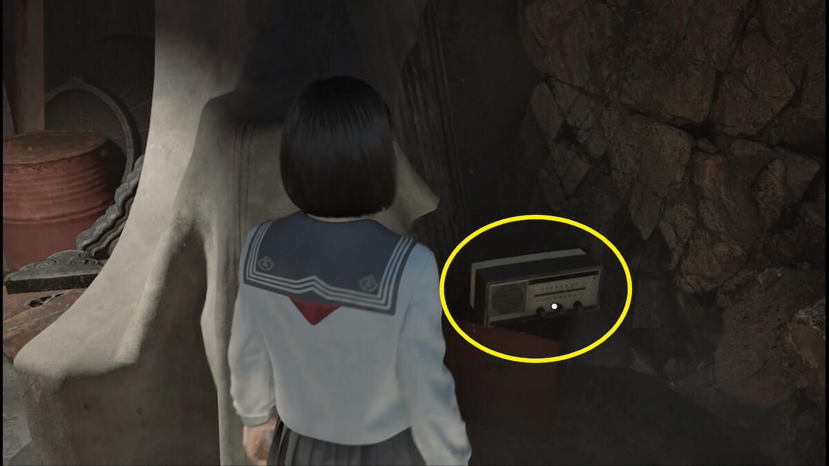 修と合流してバケモノから逃げるイベント後、建物の中を通り抜け、画像の矢印を参考に進むと、行き止まりでラジオを発見できます。