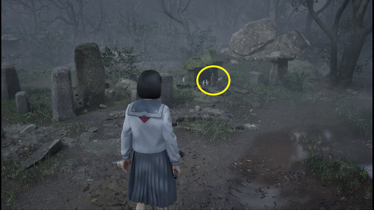 坂を下りて左側にある建物の敷地に入り、地蔵を調べてアイテム「色あせた花嫁人形」を供えます。