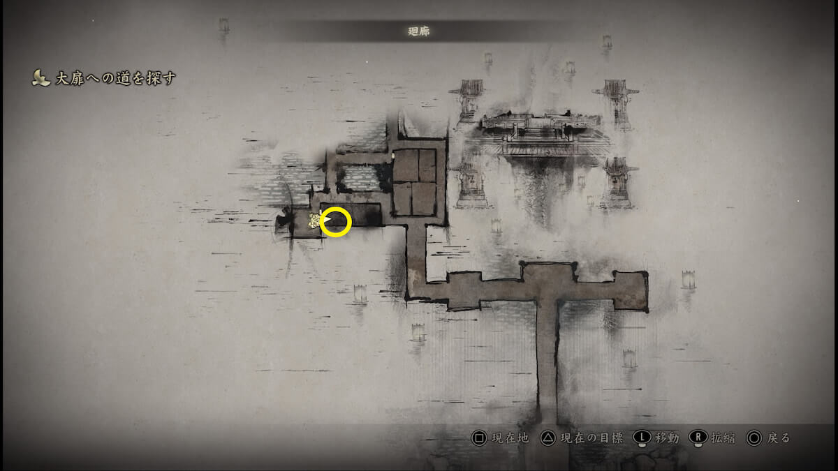 開始地点から北西の部屋に入ると、所持枠増加アイテム「刺繍入り巾着袋」を入手できます。