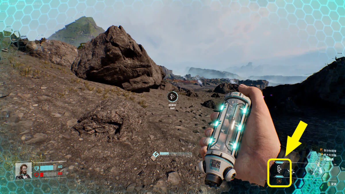 「H」キーで回復器を装備し、「左クリック」で使用するとHPが全回復します。