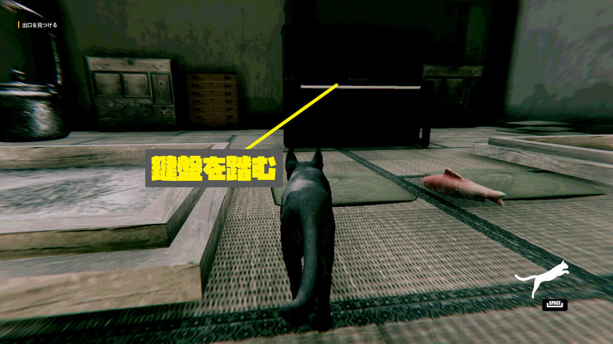 左側の部屋に入って鍵盤を踏むと、いじめっ子が移動して先に進めるようになります。そのまま玄関から脱出すると実績を獲得できます。