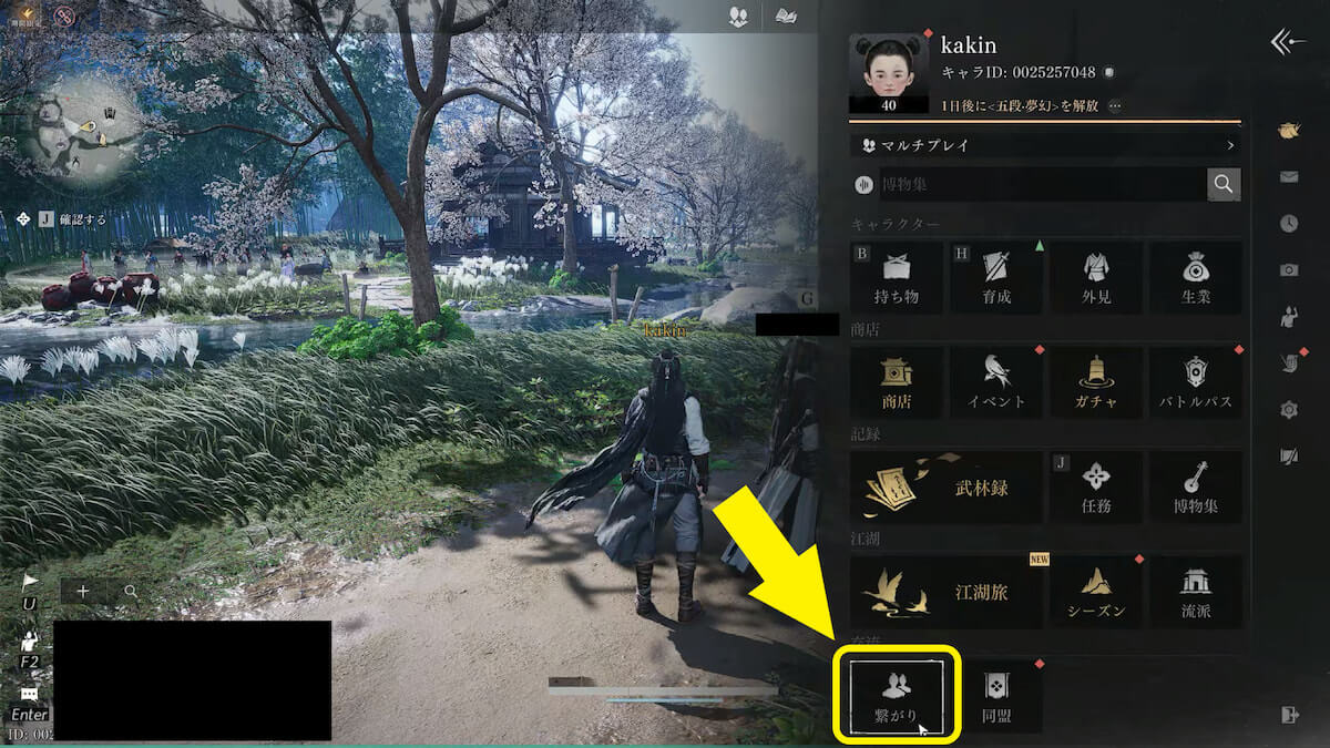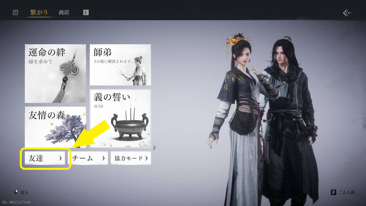 メニューから「繋がり」を開き、「協力モード」を選んでフレンドを招待しましょう。
