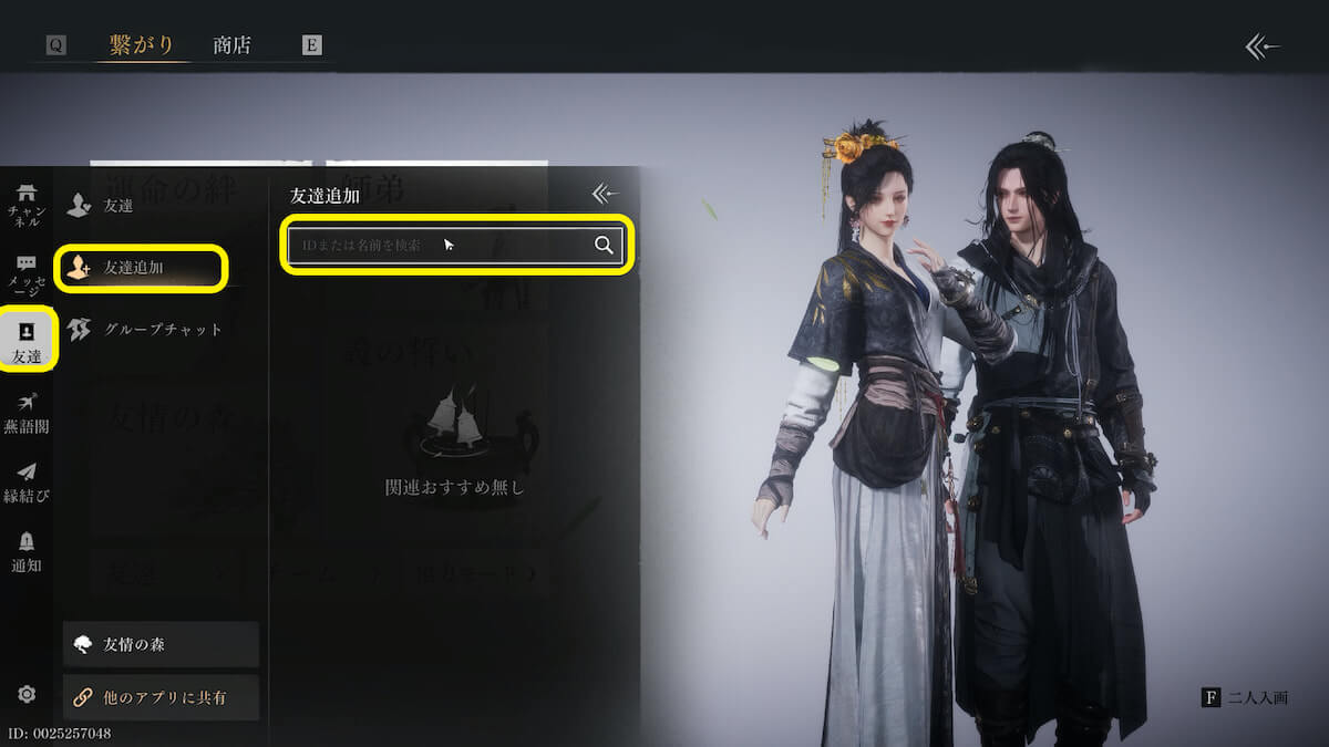 「友達」から「友達追加」を選択し、検索欄にIDまたは名前を入力してフレンド申請を送る