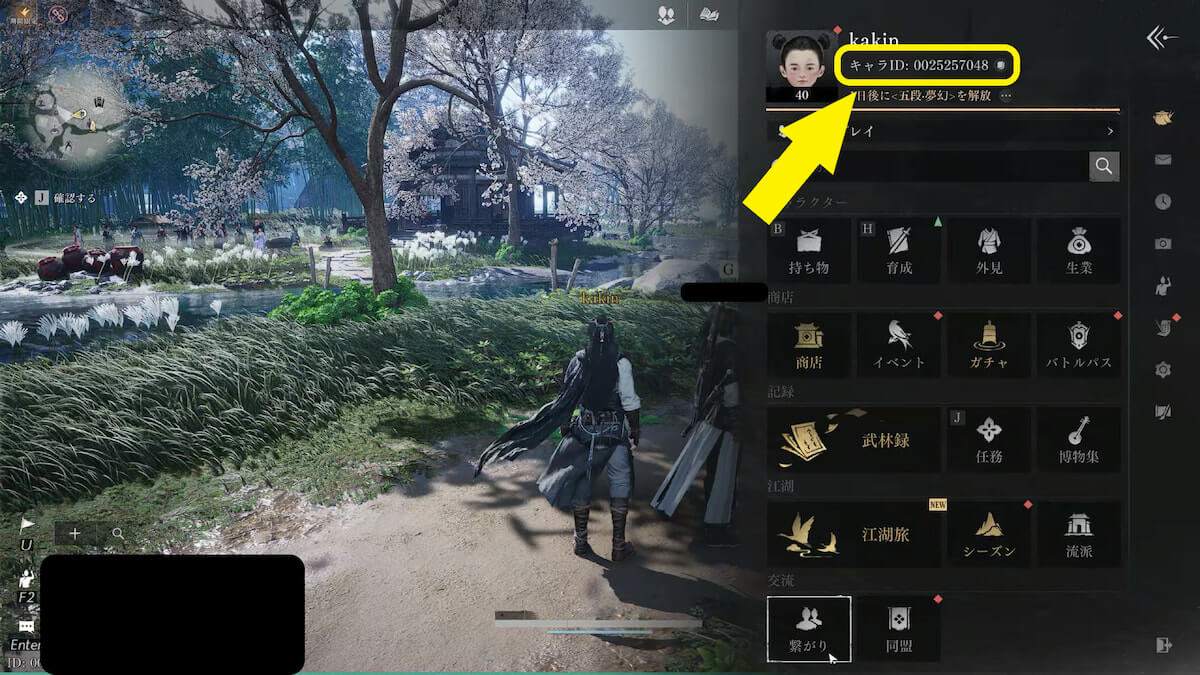 メニューを開くと、自分の名前の下にIDが表示されています。