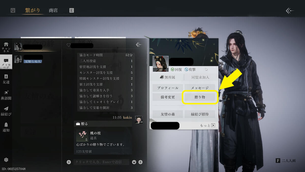 贈り物によって友情レベルが上がり、友情の森の進捗も進みます。